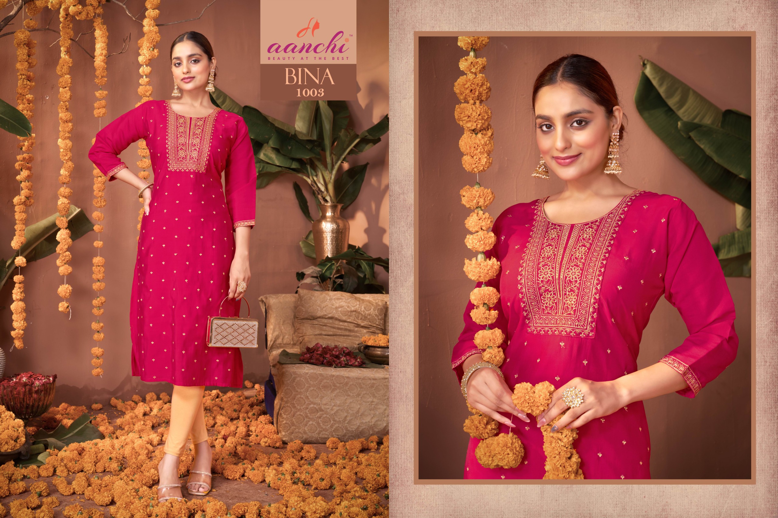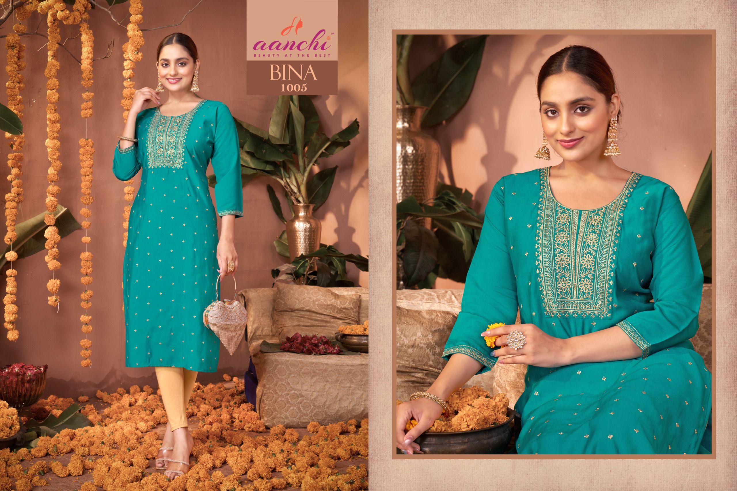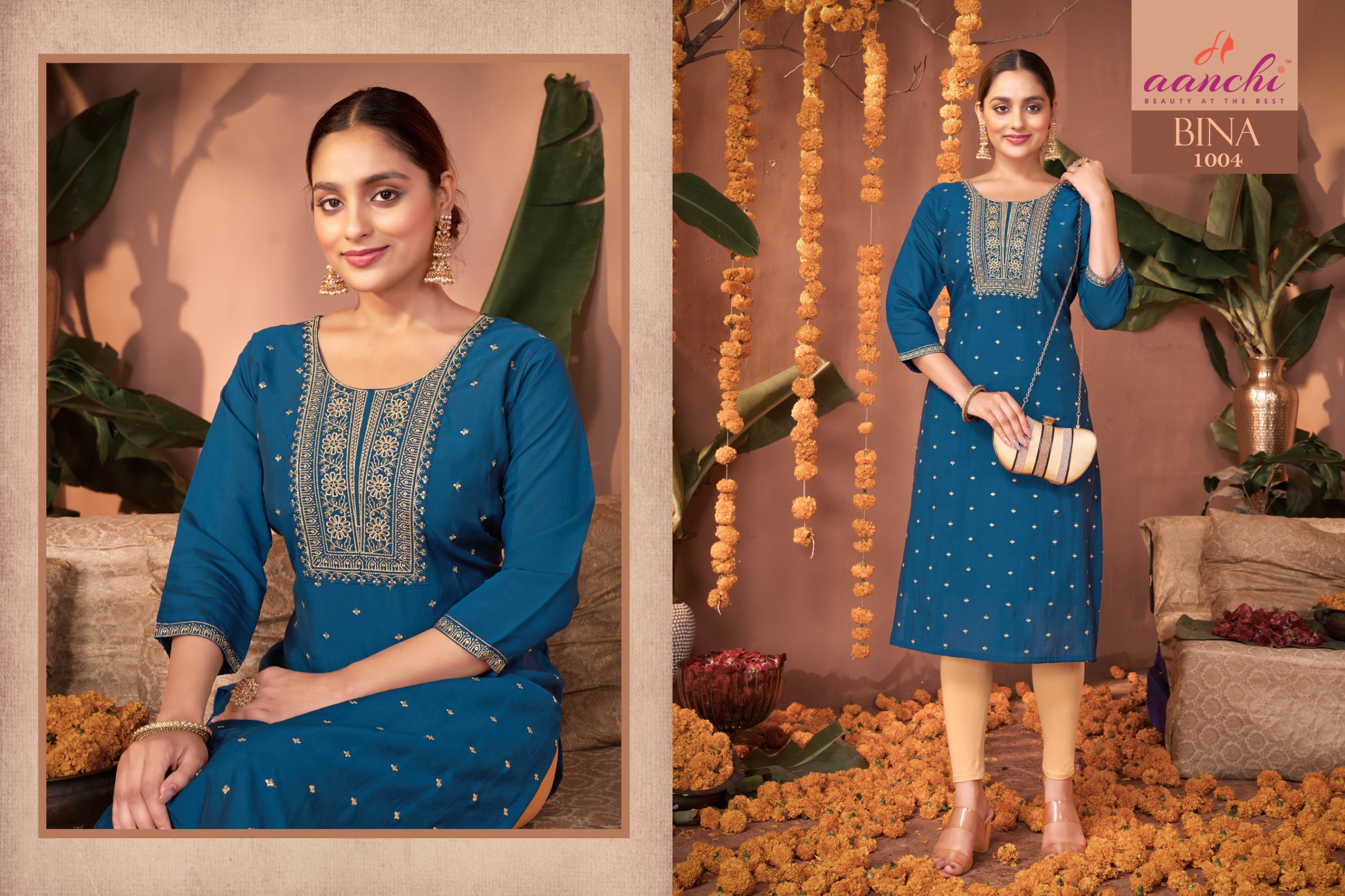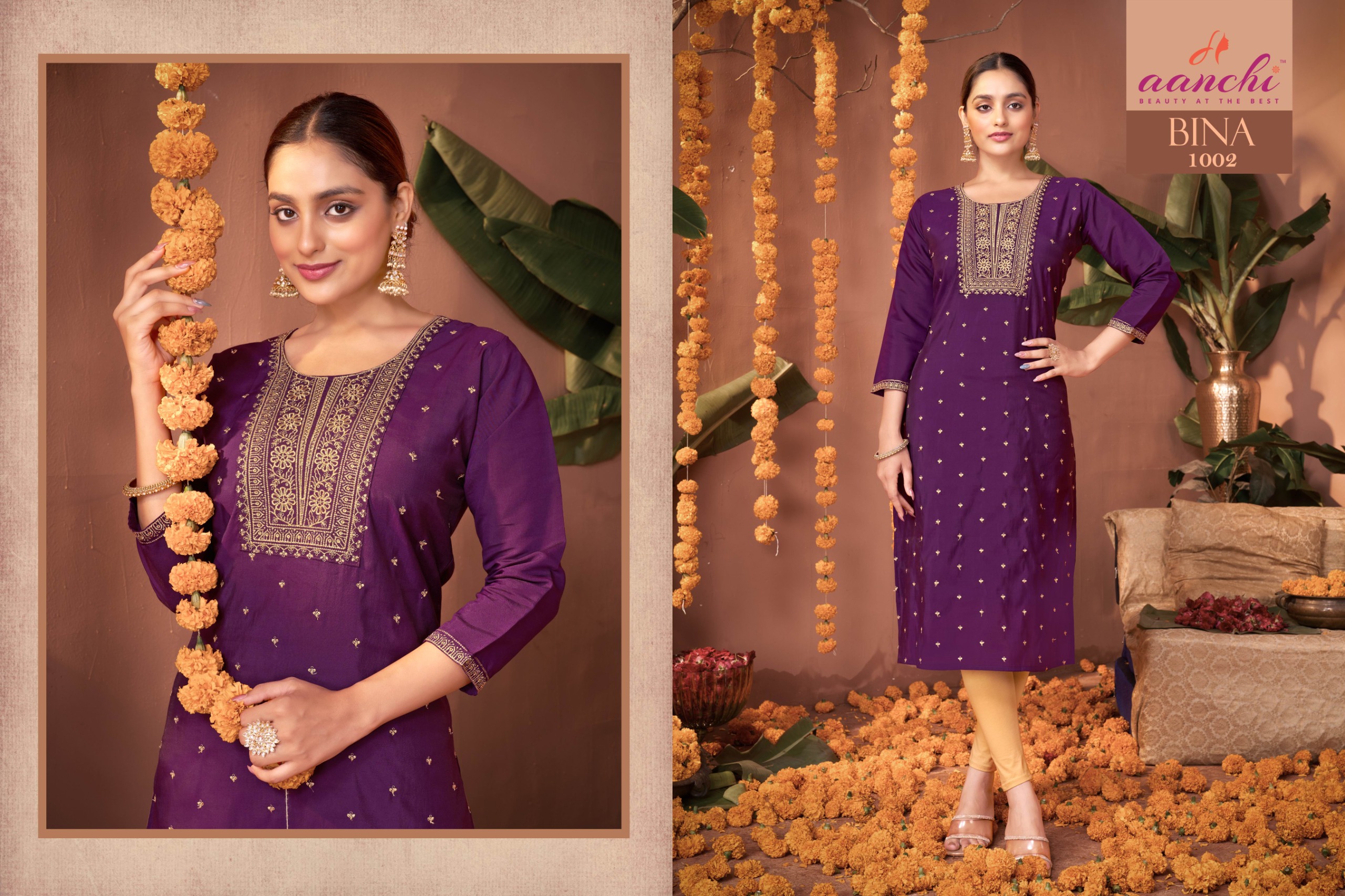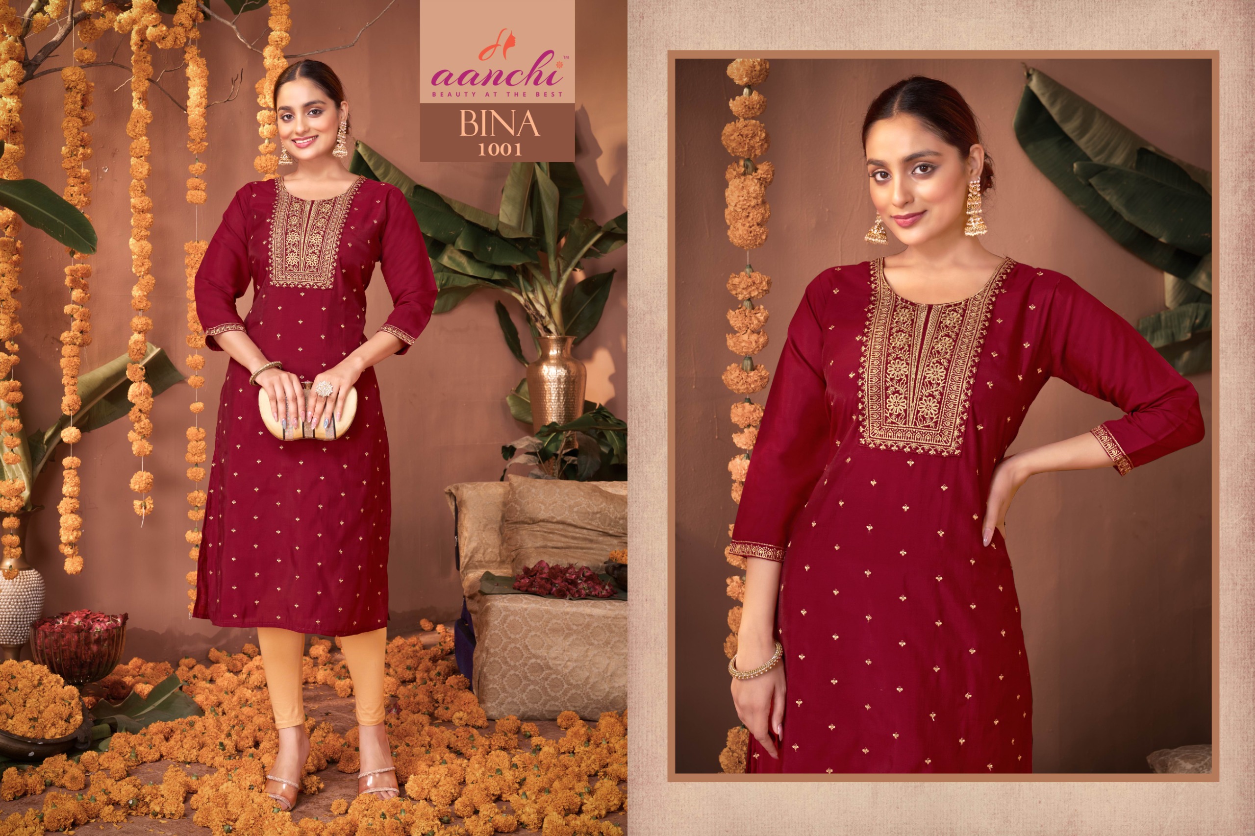 Buy Aanchi Bina straight cut Roman silk kurtis with fancy embroidery work at wholesale rate.