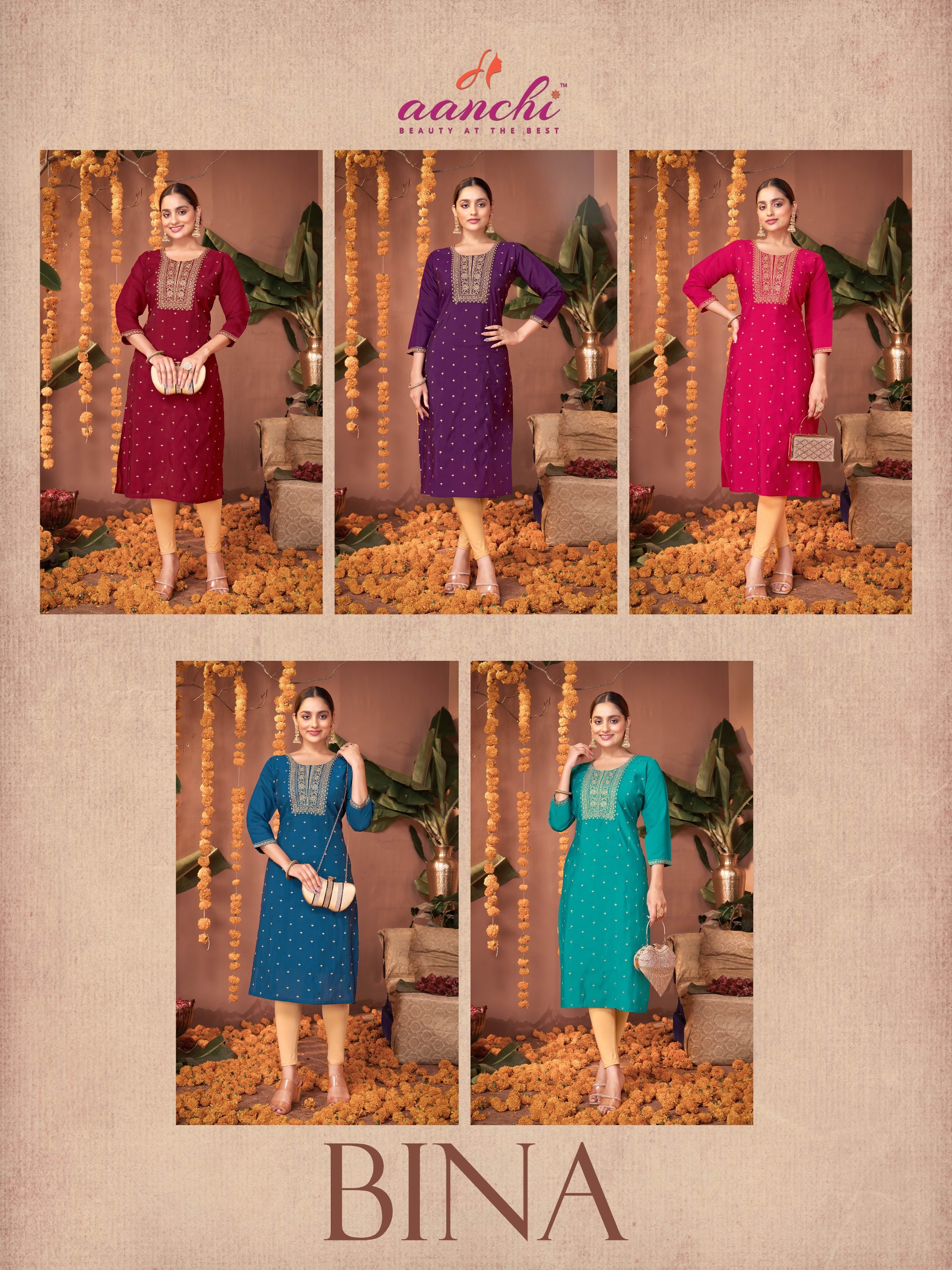 Aanchi Bina Roman Silk Embroidered Wholesale Kurti Collection.