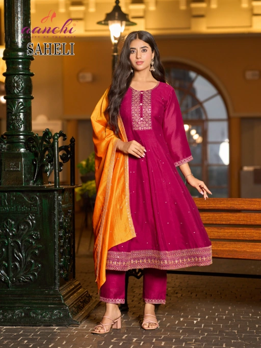 ✨ Step into grace with Saheli by Aanchi – a refined combination of vichitra silk, elegant flair, and beautiful contrast dupattas to elevate your ethnic
