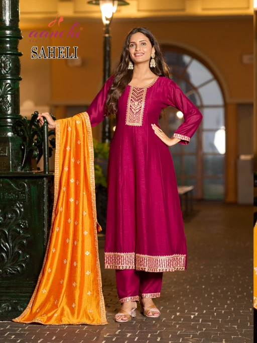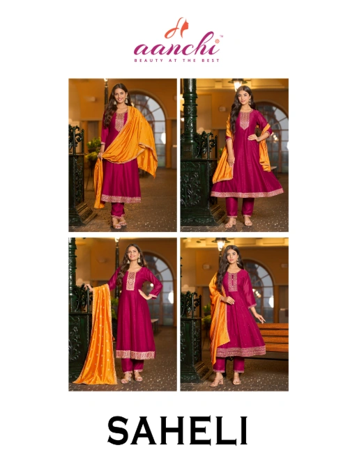 Buy Aanchi Saheli 3-piece vichitra silk flair suit sets at a wholesale rate.