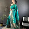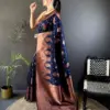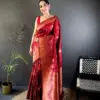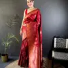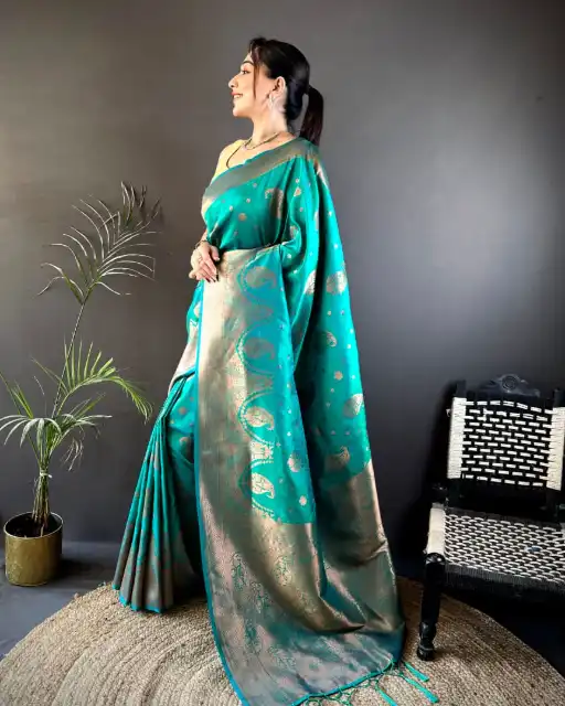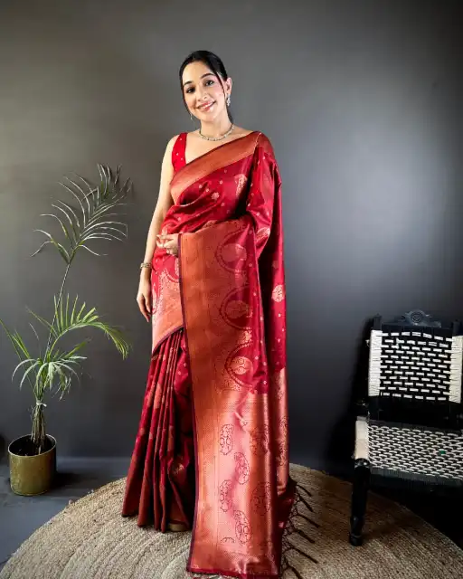 Buy Aarti Banarasi Silk Sarees online at a wholesale rate. This elegant saree features soft banarasi silk with an intricate copper jari mango border design, rich pallu, and a weaving blouse with a border.