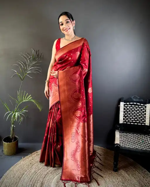 Saree: Super-Soft Silk Banarasi Sarees with Beautiful Copper Jari Weaving Mango Design on Border, Rich Pallu, and Tassels