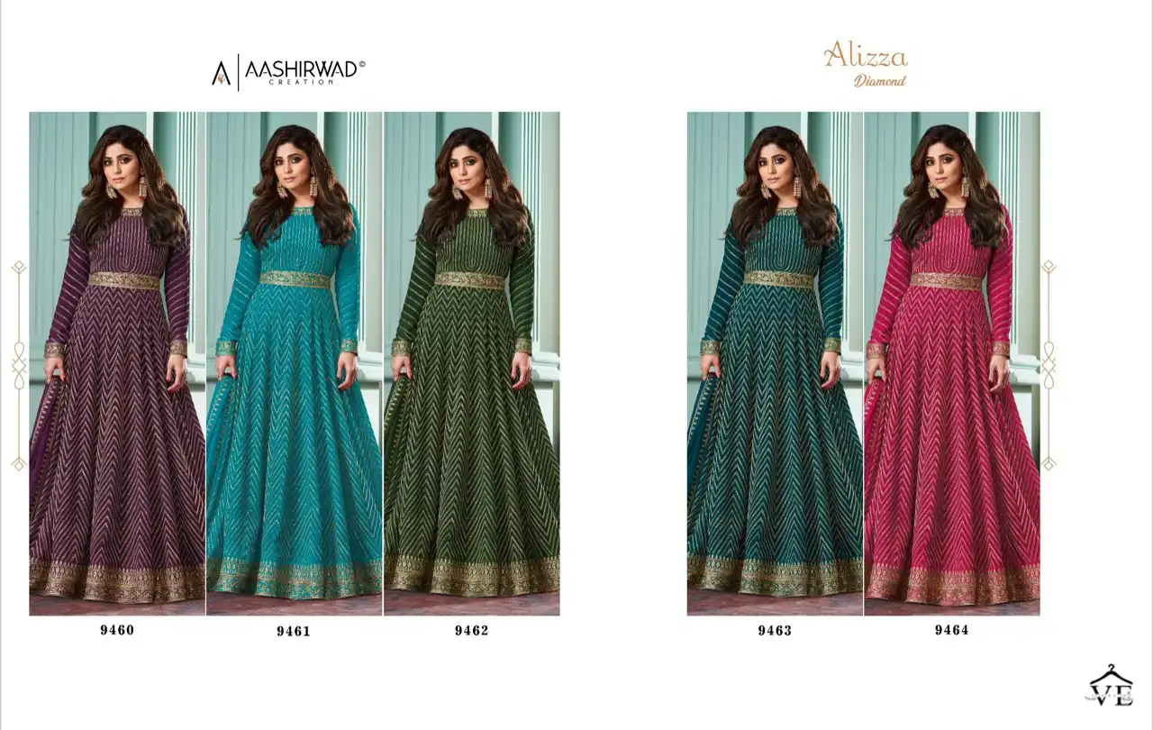 Aashirwad Alizza Diamond Real Georgett Wholesale Designer Readymade Salwar Suit Catalog 5 Pcs. We deal in Kurtis, Sarees, Dresses Materials, Leggings, and Designer Salwar Kameez.