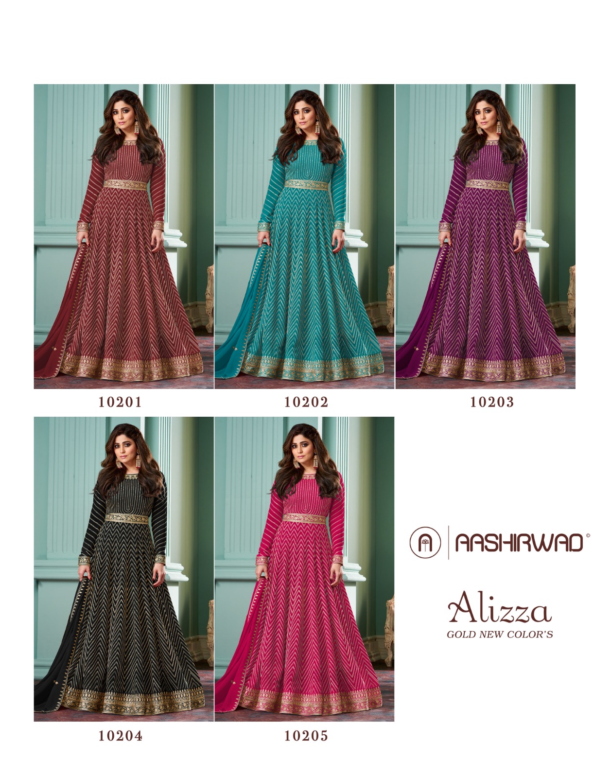 Introducing the Aashirwad Alizza Gold collection, a stunning range of free-size stitched suits designed for effortless elegance. This collection features vibrant new colors crafted from premium real georgette fabric, perfect for every occasion. The top is free-size stitched (XL size), paired with a matching dupatta made from real georgette, offering a luxurious and graceful drape.
