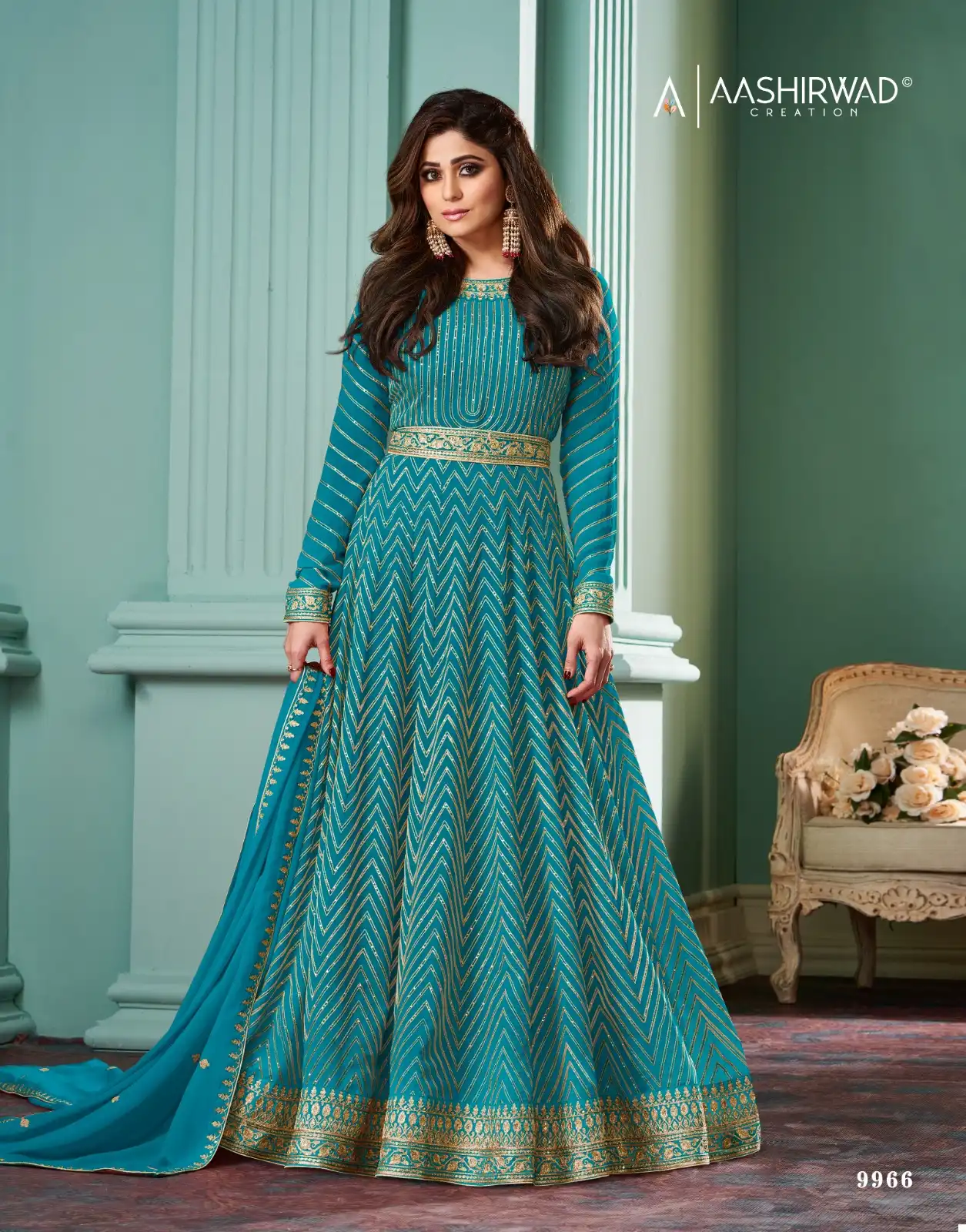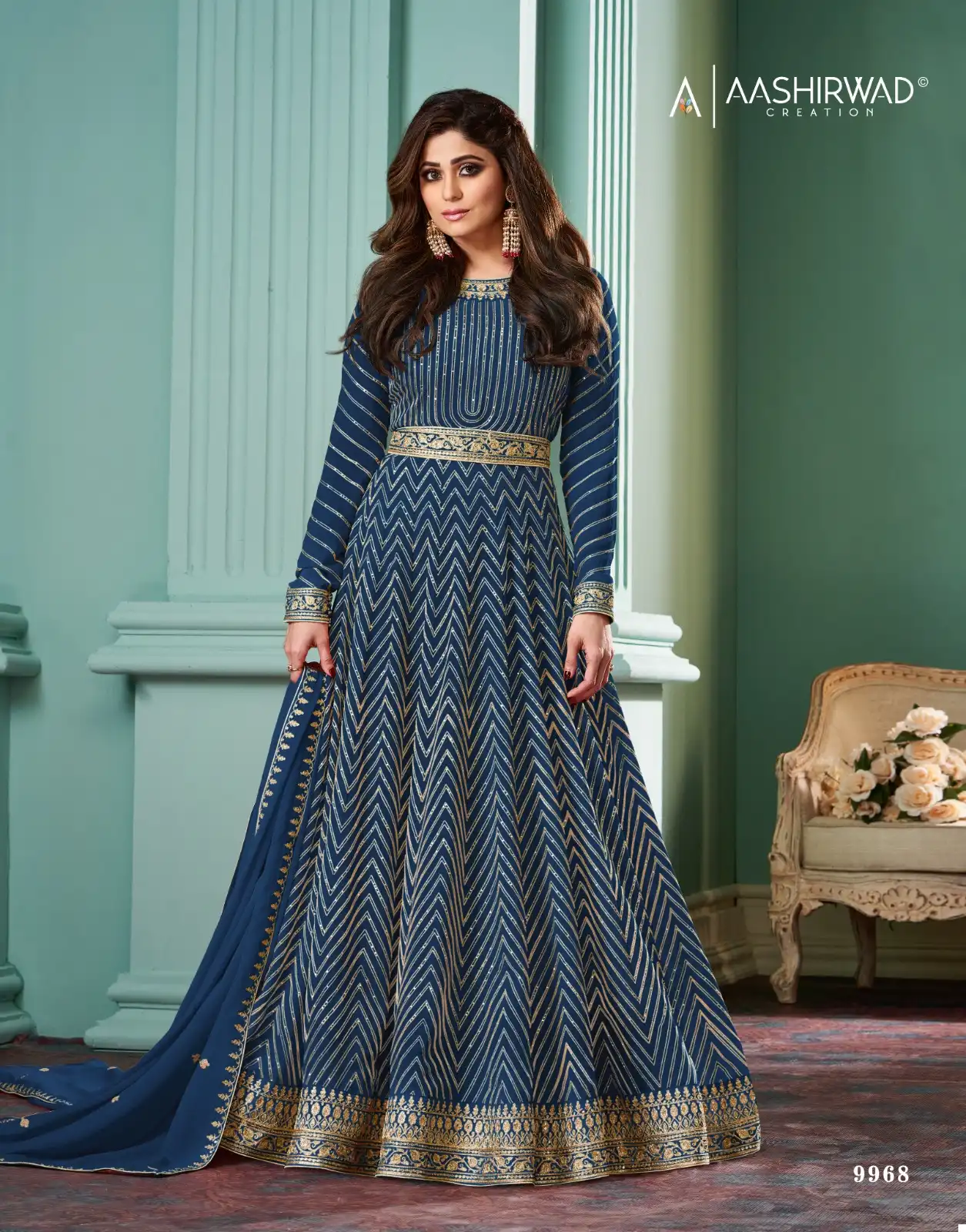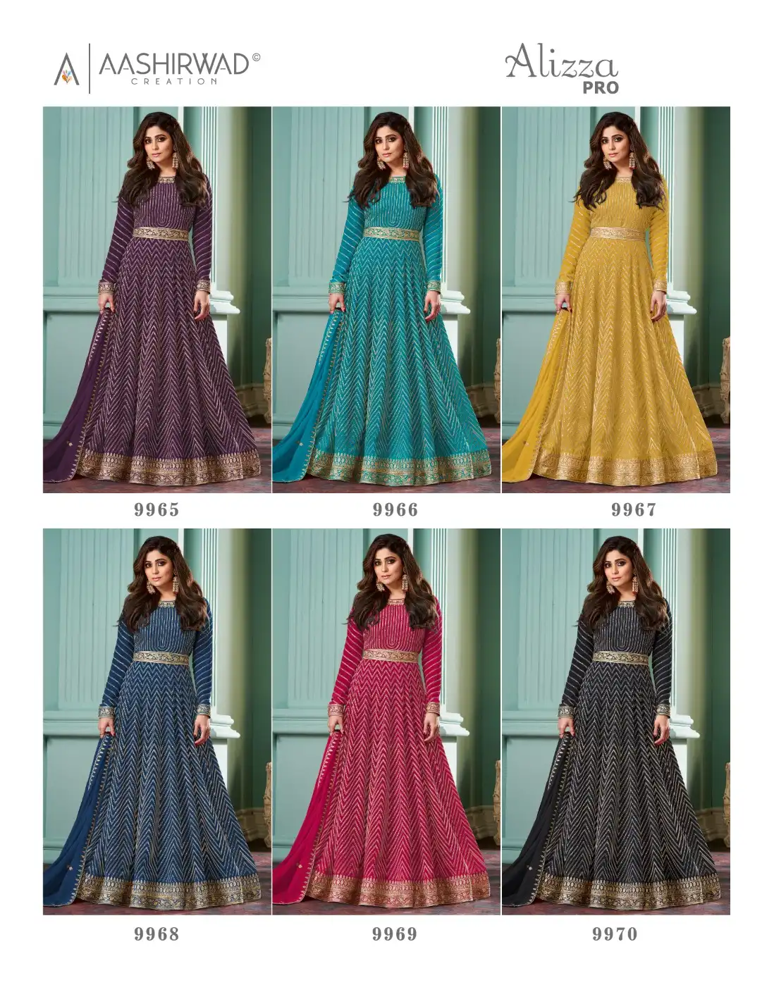 Aashirwad Alizza Pro Real Georgette Wholesale Designer Long Gown with Dupatta Catalog