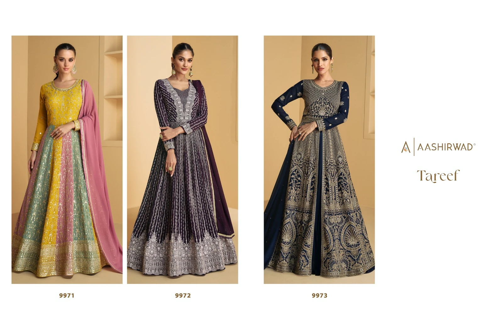 Aashirwad Tareef Real Georgette Wholesale Partywear Gown with Dupatta Catalog