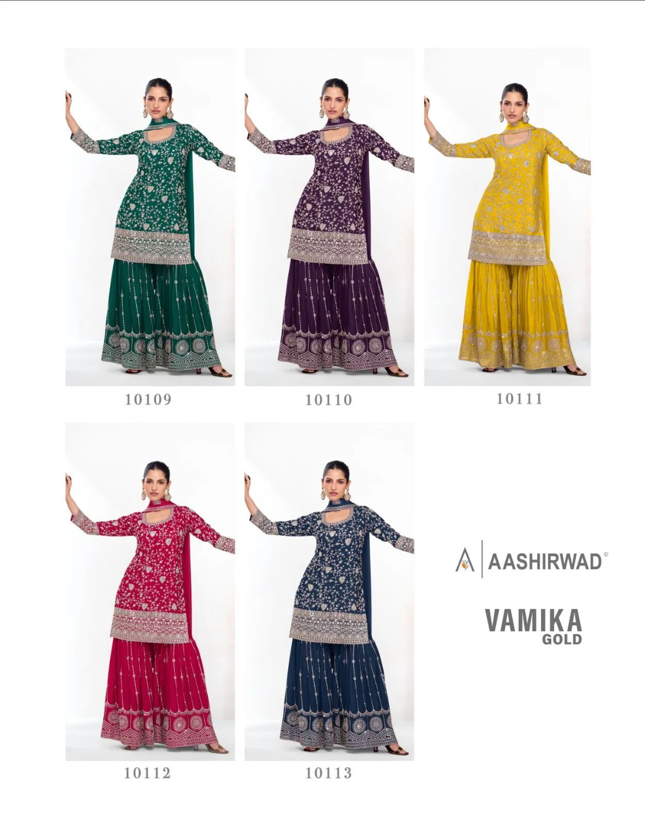 Aashirwad Vamika Gold Chinon Wholesale Designer Salwar Suit Collection