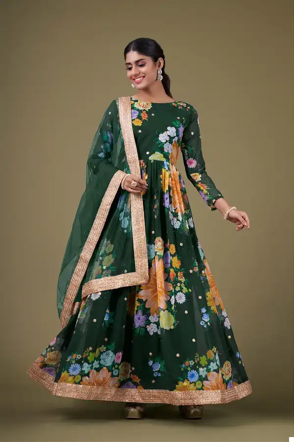 - Fabric: The top is crafted from high-quality Faux Georgette, known for its lightweight and flowy texture, while the bottom is made from Heavy Dull Santoon Silk, offering a luxurious feel and elegant drape.