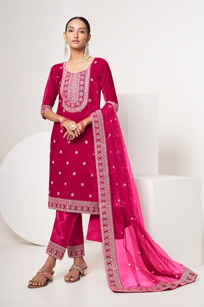 - Premium Velvet Fabric: Immerse yourself in the luxurious feel and richness of premium velvet fabric. Velvet offers a plush touch and an elegant sheen, ensuring these salwar suits are not only stylish but also incredibly luxurious.