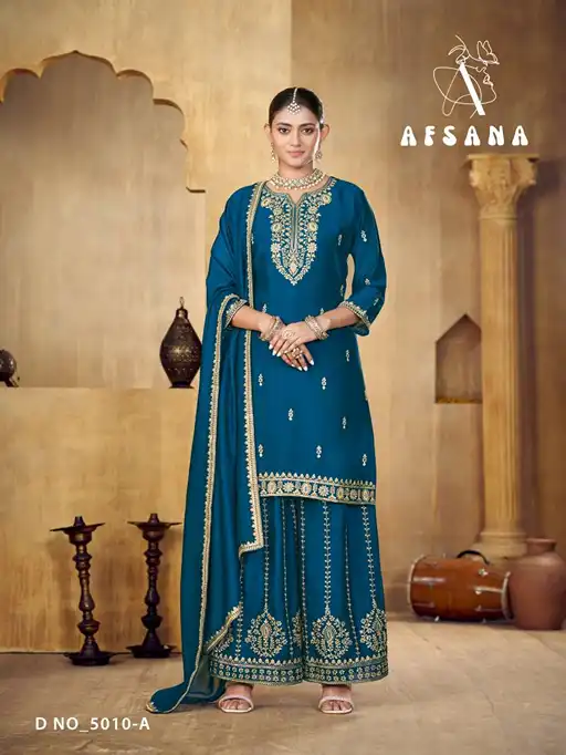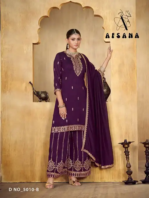 Shop Afsana 5010 A & B Marvel Silk Salwar Suit Sets with 2mm sequins and elegant coding work at ₹1970 + GST. Premium ethnic wear available in 8 stylish designs and sizes L to 3XL.