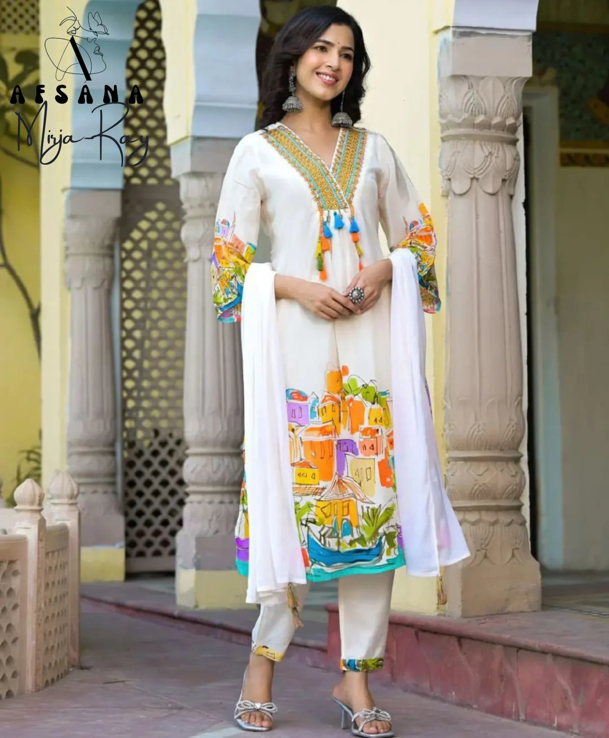 👚 Top: Rayon Digital Print featuring a V-Neck design embellished with intricate Embroidery Work and Tesal detailing, ensuring a chic and sophisticated look.