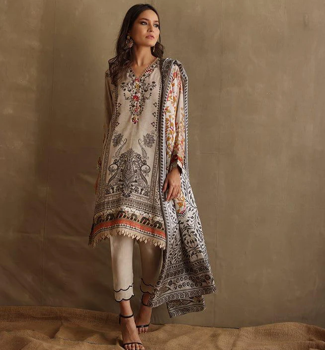 Cotton Embroidery Top with Roman Based Bottom and Muslin Sequence Work Dupatta