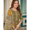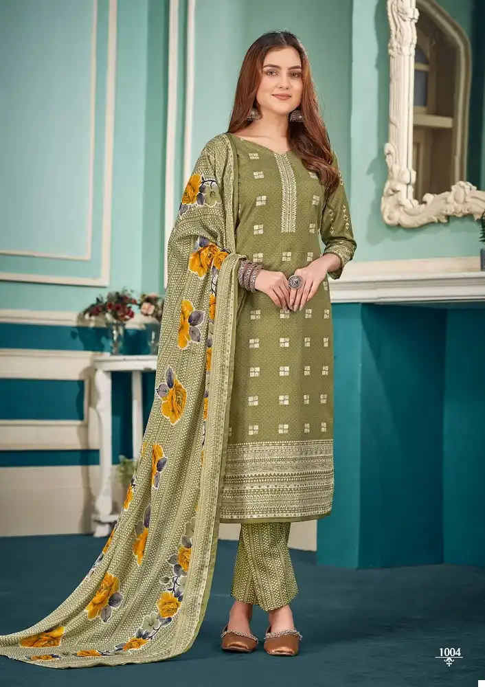 - Top: Each suit features a top cut from pure soft cotton adorned with exquisite foil print. The generous cut of 2.40 meters allows for versatile styling, suitable for kurtas and tunics alike, ensuring a look that’s both comfortable and chic.