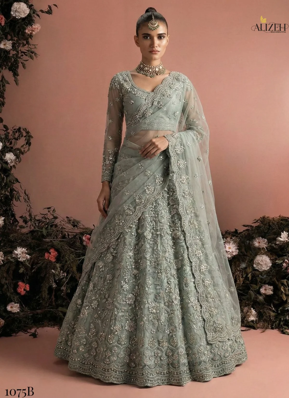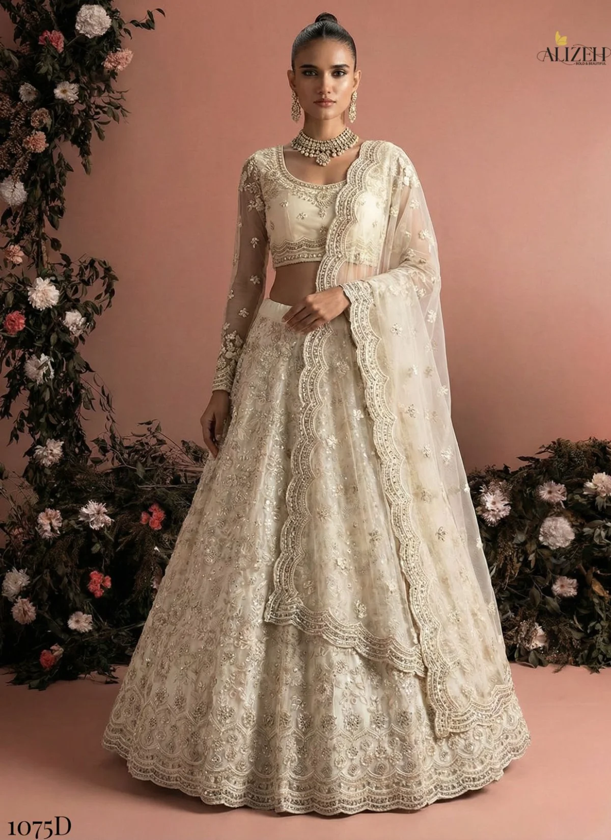 - Step into refined elegance with the Alizeh 1075 Lehenga Collection, a premium unstitched ensemble designed for modern women who love graceful silhouettes blended with luxurious fabrics. This collection showcases a beautifully coordinated lehenga, blouse, and dupatta crafted in butterfly net, paired with a rich Banglori silk inner, ensuring both comfort and a flawless drape.
