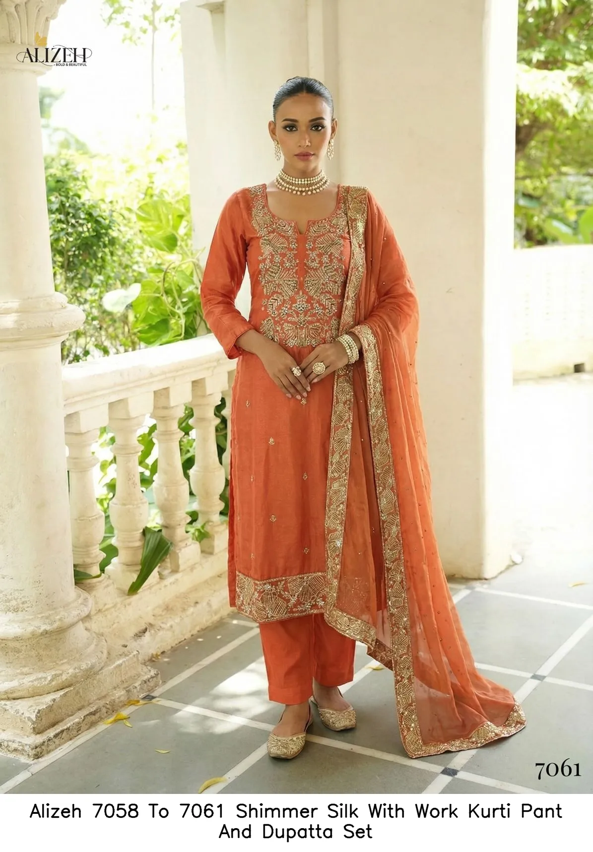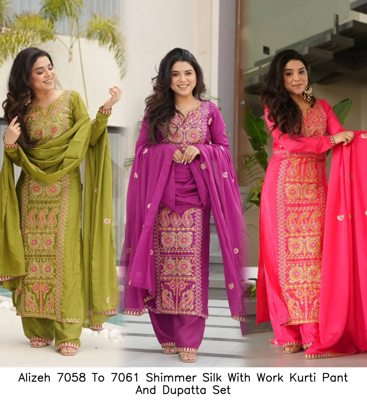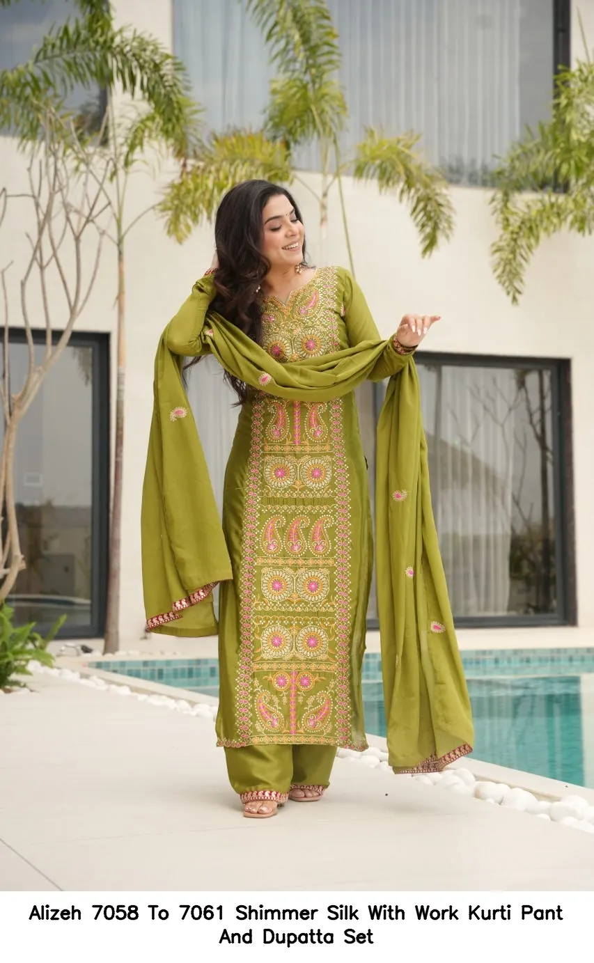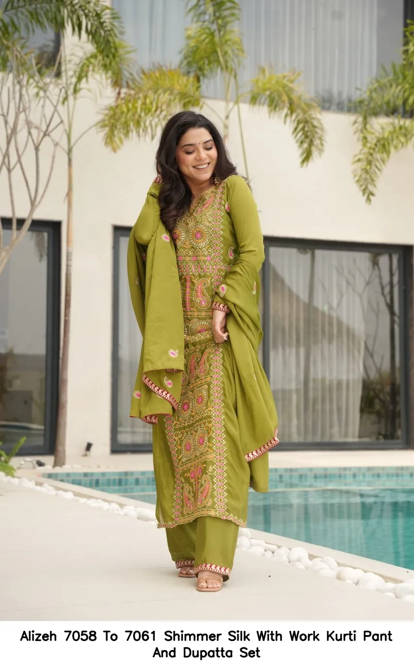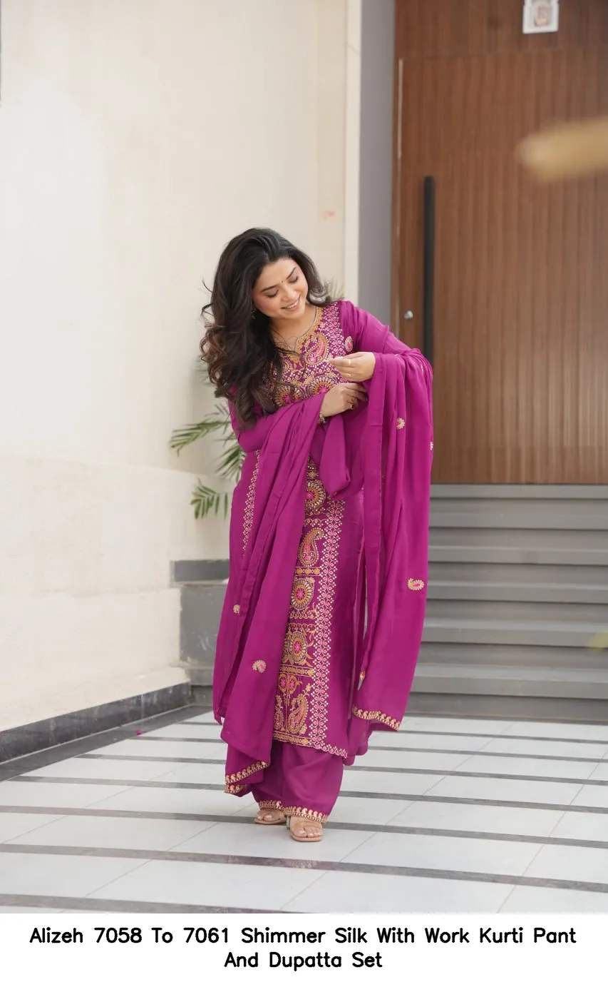 Alizeh 7058 To 7061 Shimmer Silk With Work Kurti Pant And Dupatta Set