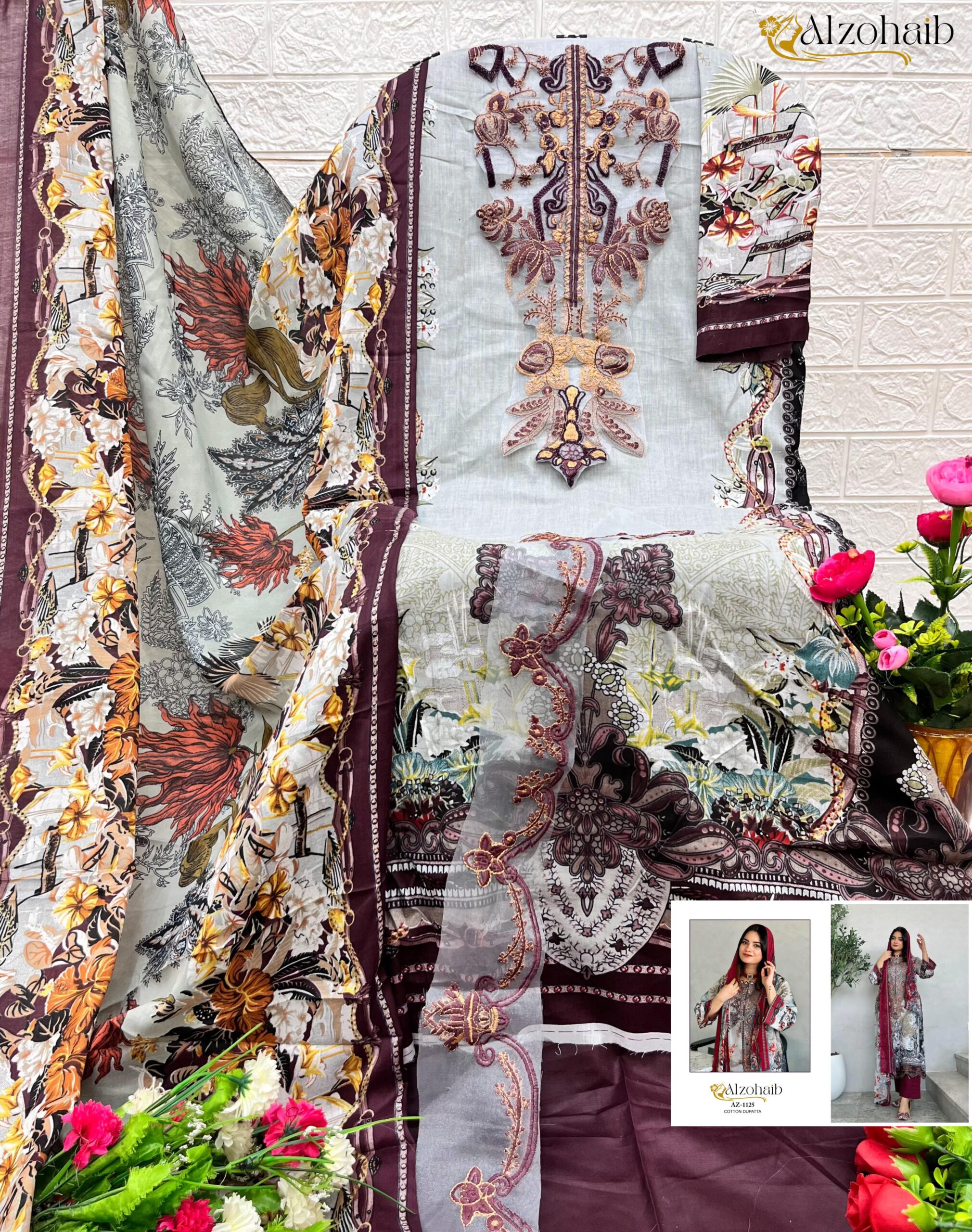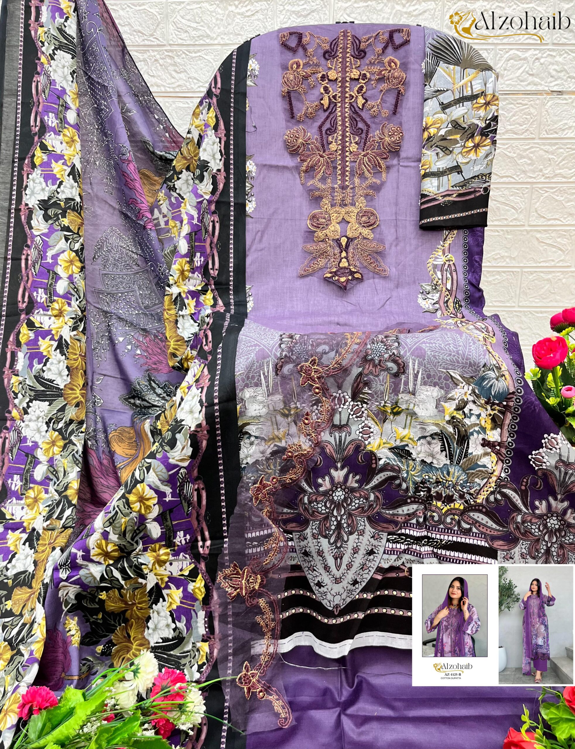 Upgrade your ethnic wardrobe with the Alzohaib AZ 1125 A & B Collection, a perfect blend of comfort and elegance. Crafted from premium cotton fabric, this Pakistani-style suit features a printed cotton top with intricate patchwork, semi-lawn bottom, and a matching cotton dupatta. Designed for effortless grace, this collection is an ideal choice for casual and festive wear.