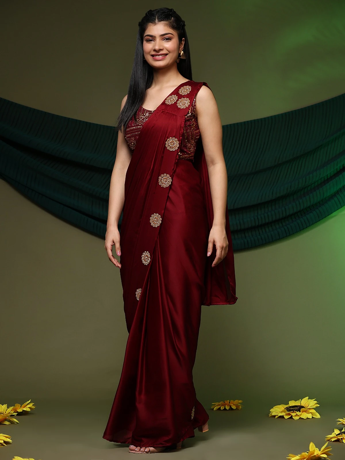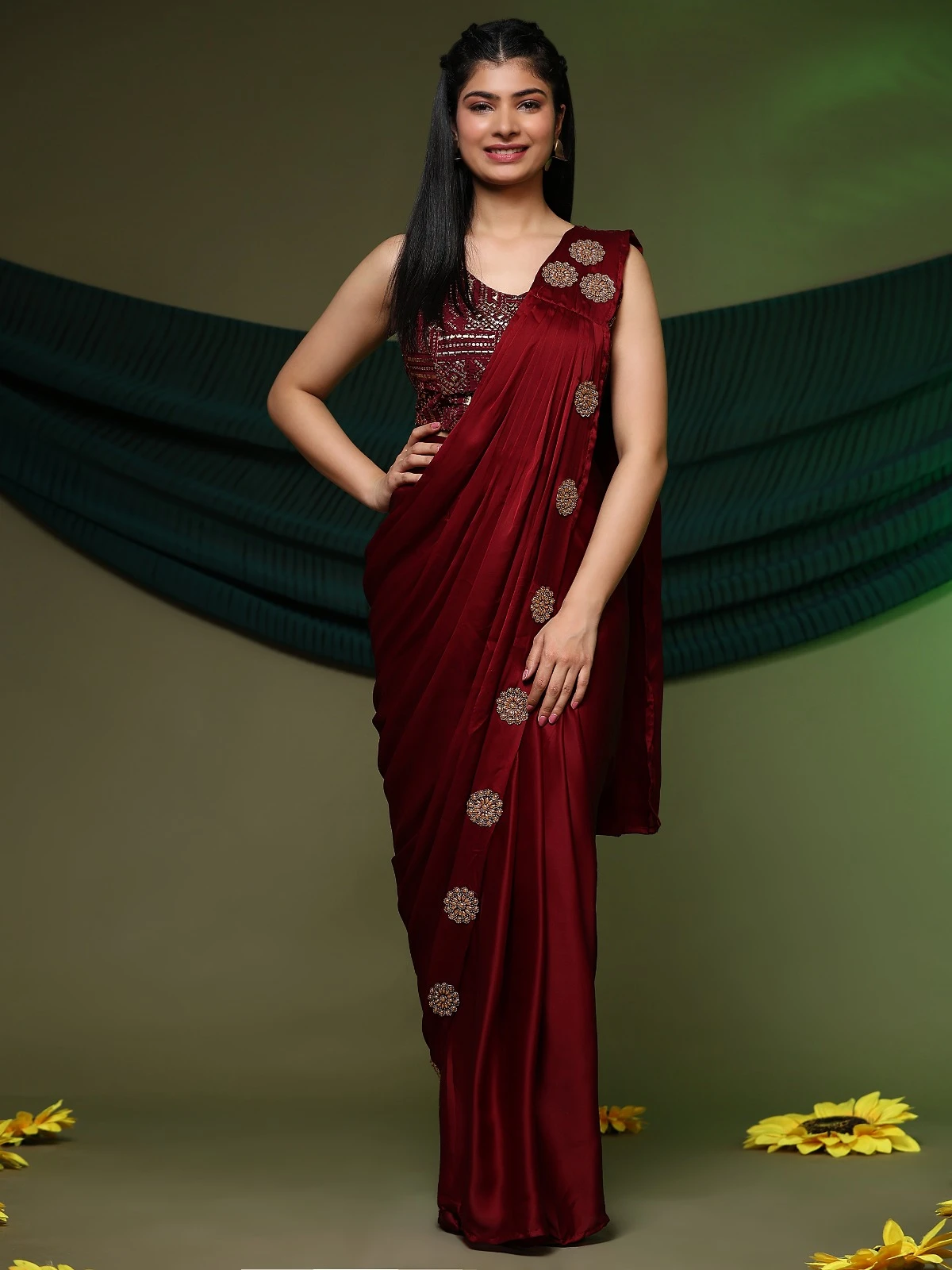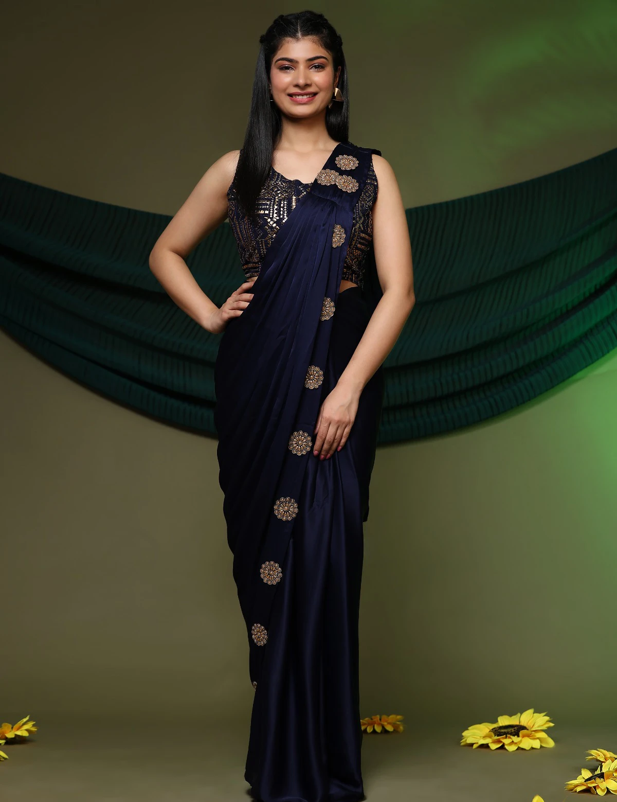 This set includes a saree made from Pure Satin fabric, featuring a border for a classic look and smooth drape. The blouse is adorned with exclusive sequin embroidery and intricate thread work, adding elegance and sophistication. The saree is available in a size 36 with margins extended up to size 40, with sleeves inside for comfort. Offered in a choice of 2 colors, this set provides options for both style and preference.