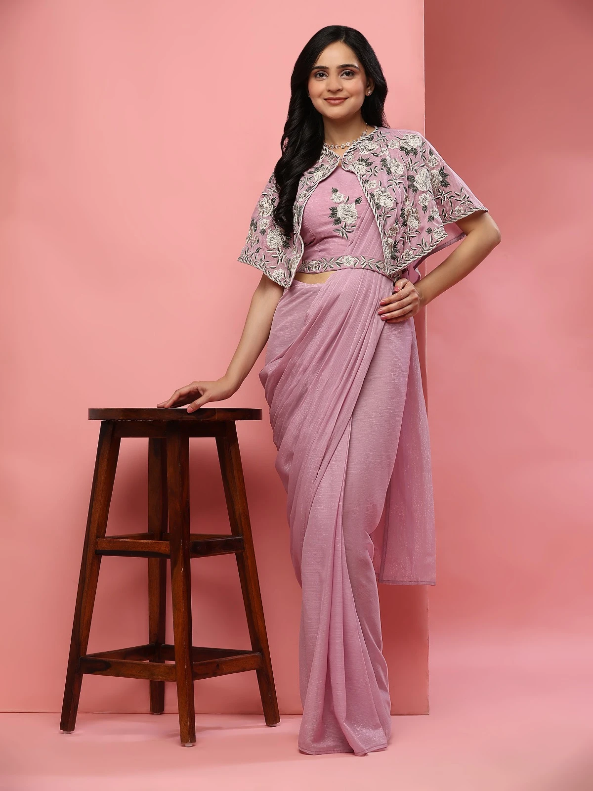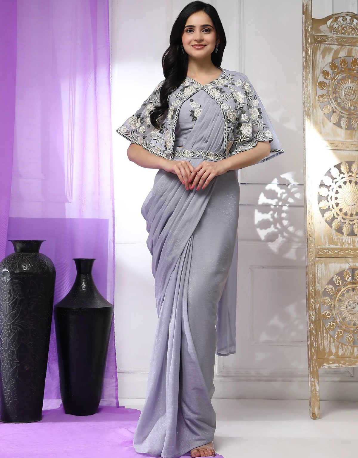 Imported Chiffon Saree with Embroidered Belt and Floral Cape Blouse