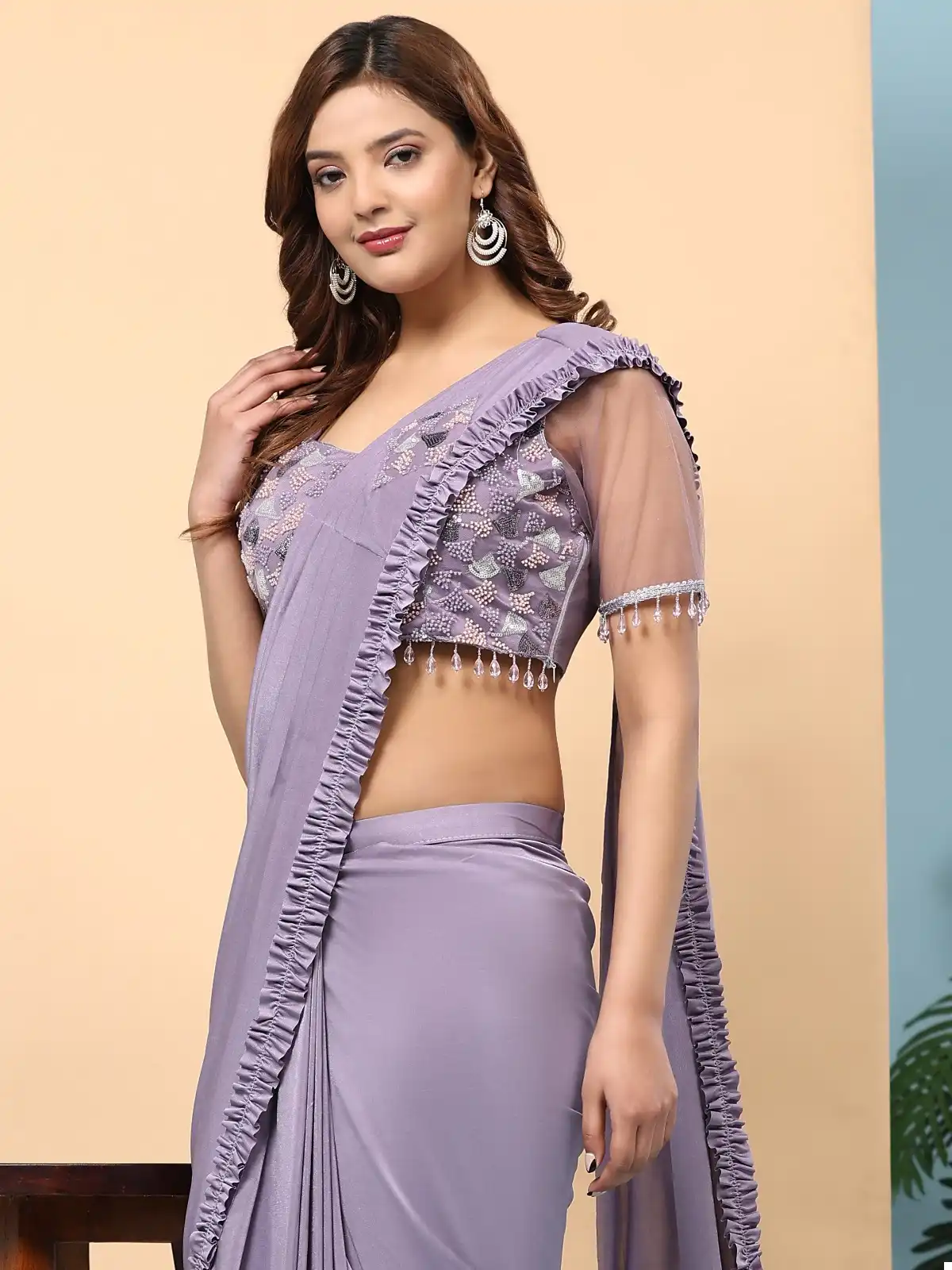 - The saree is made of Fancy Imported Fabrics and features a Frill Border.