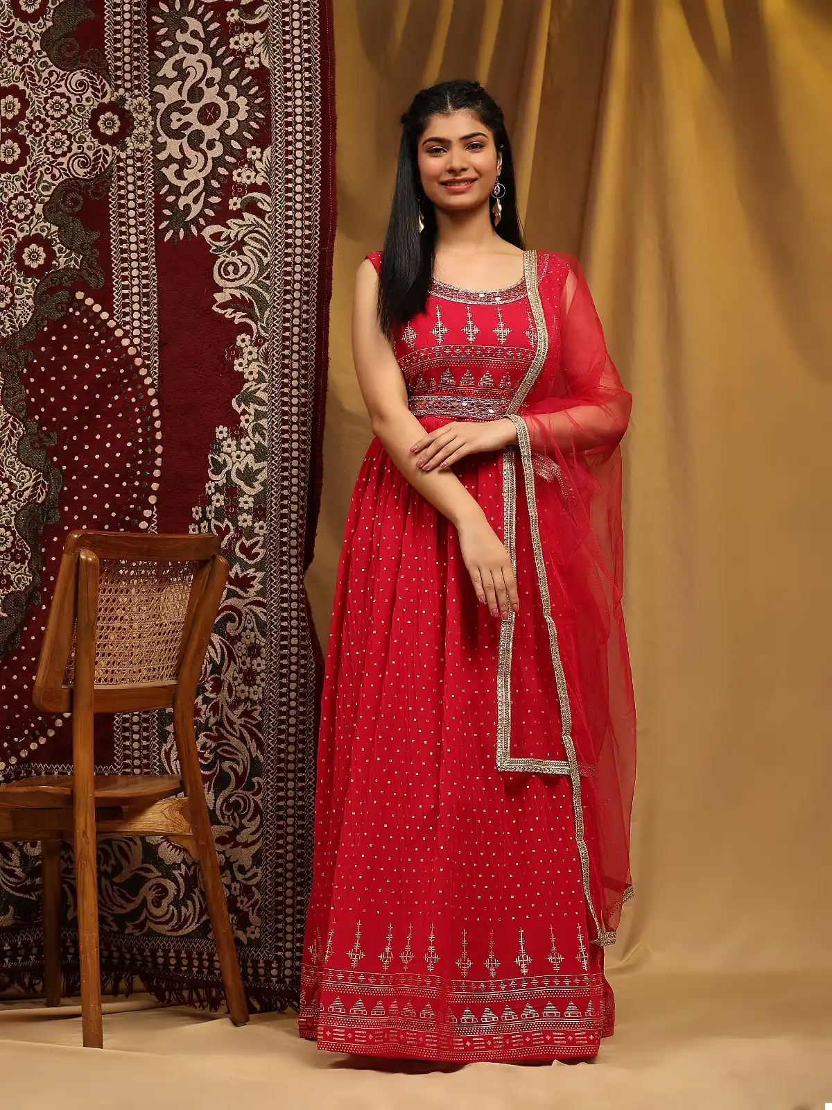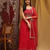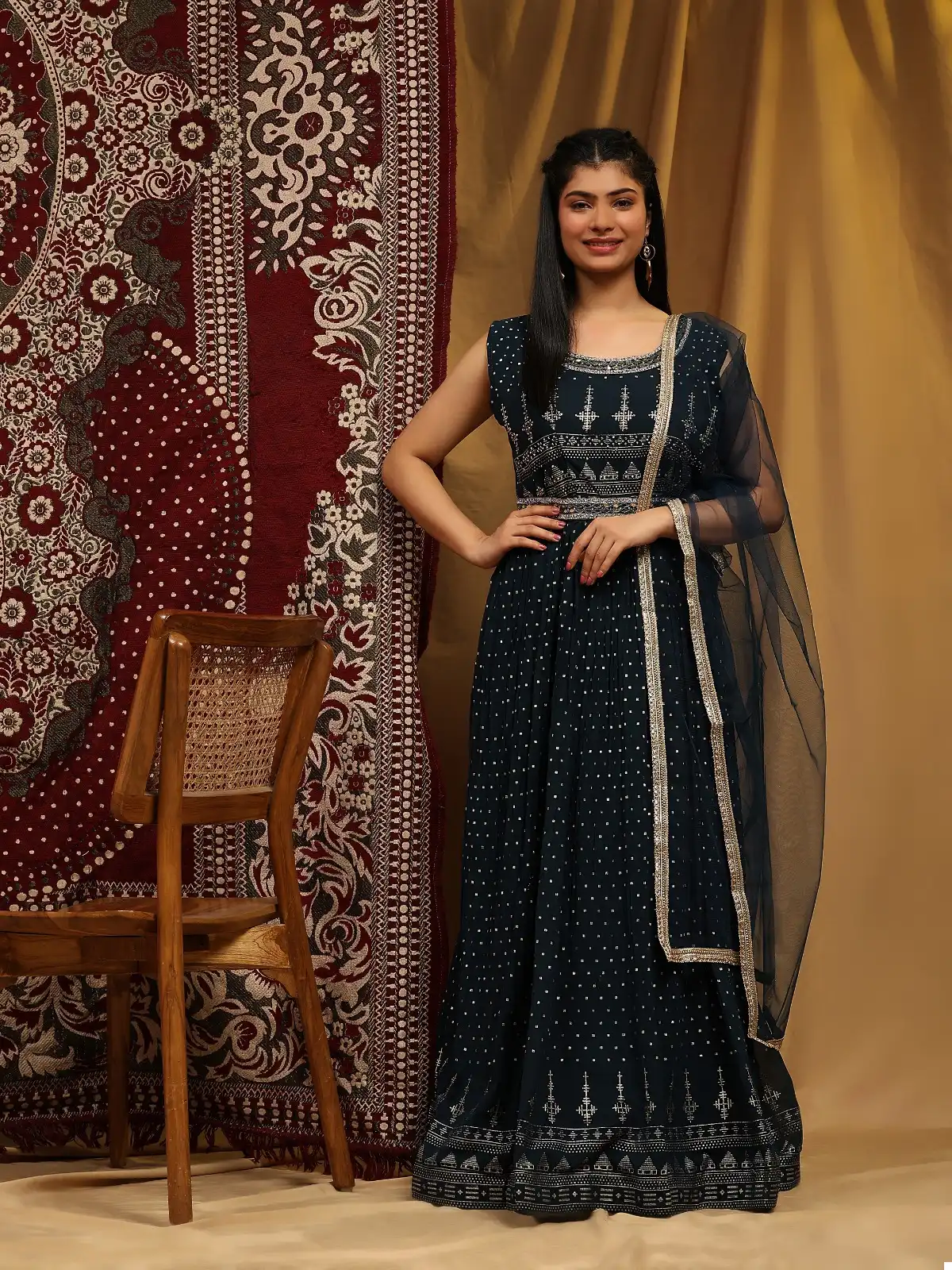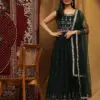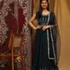 Priced at ₹3270 per piece, this pure georgette gown collection combines luxury and elegance. Each set includes a designer gown with a hand-embellished neck and belt, paired with a matching pure georgette dupatta featuring sprangle and print work. Available in size XL, these gowns are sold as complete sets, making them perfect for formal events, parties, and special occasions. The intricate handwork and high-quality fabric ensure a stunning appearance that will make a lasting impression.