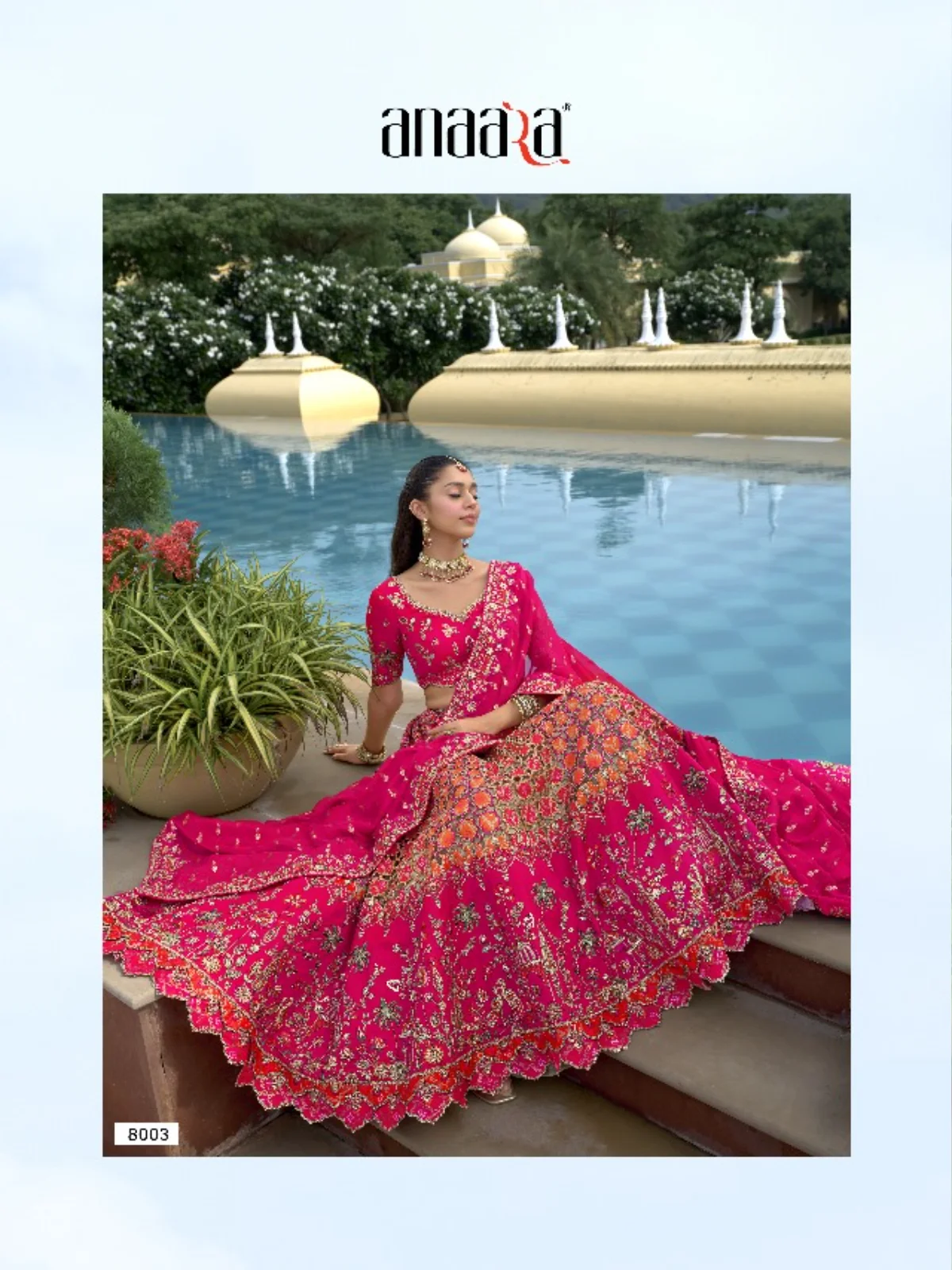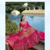 - Turn heads at every celebration with this vibrant Anaraa designer bridal lehenga choli, crafted in a striking hot pink hue beautifully contrasted with warm orange and gold accents. The lehenga showcases exquisite jaali-style lattice embroidery, detailed floral motifs, and traditional zari work that reflect exceptional craftsmanship and festive grandeur.