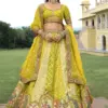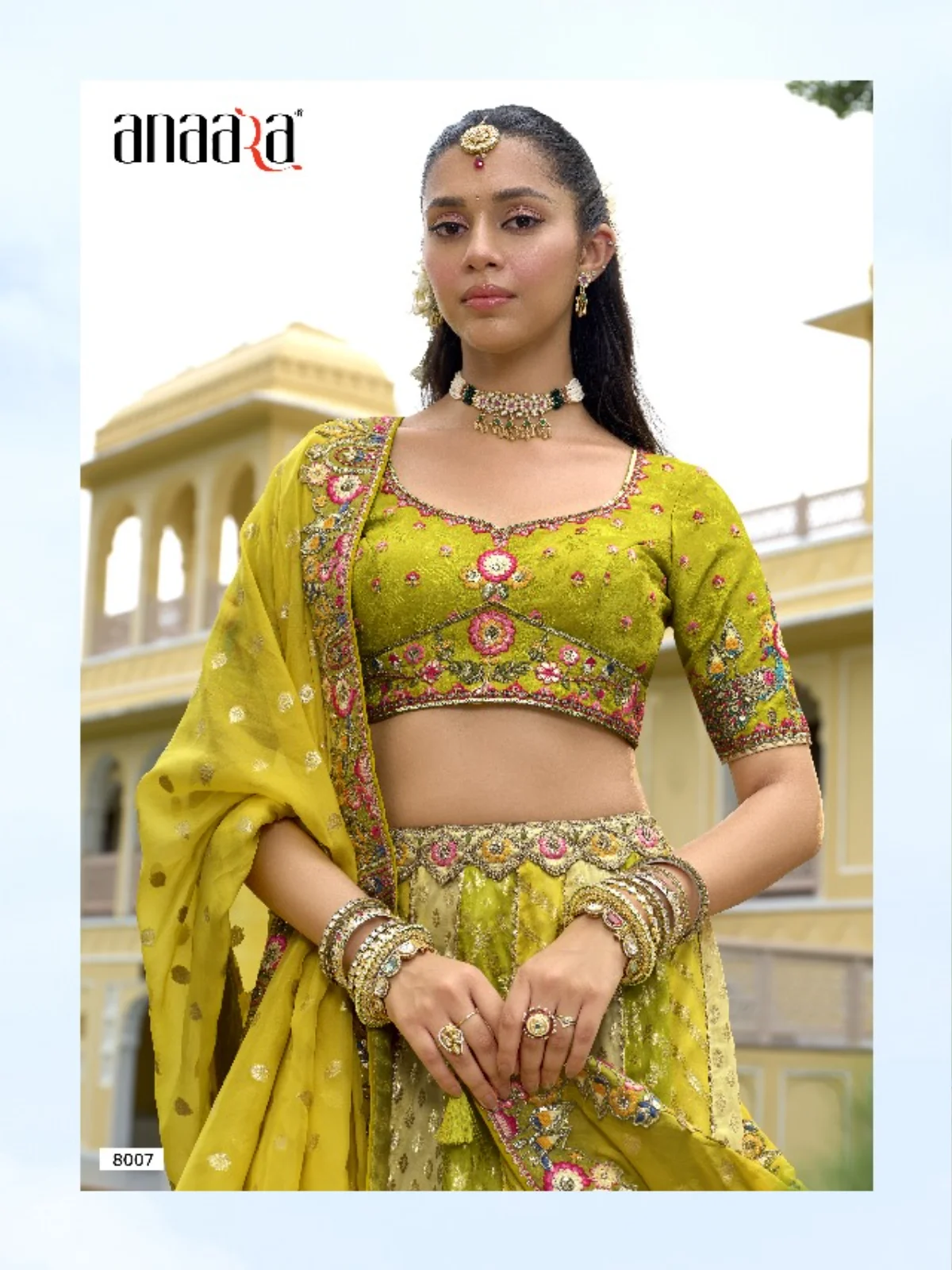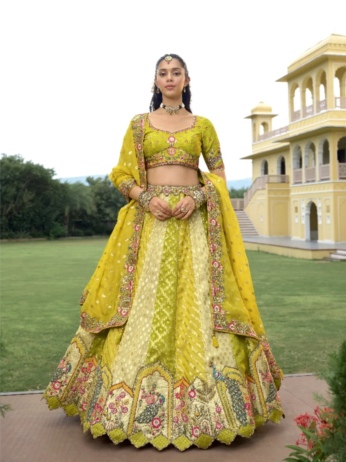 - This stunning Anaraa designer lehenga choli is a graceful fusion of refreshing lime green and soft ivory hues, crafted to make a bold yet elegant bridal statement. The lehenga showcases beautifully arranged embroidered panels featuring traditional floral motifs, intricate resham and zari work, and artistic detailing inspired by royal Indian architecture.