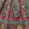 Work: The lehenga, blouse, and dupatta are adorned with meticulously crafted 5mm and 3mm sequin work, Chappat Zari work, Dori, and multi-thread embroidery. Additionally, diamond-studded accents and velvet patchwork elevate the ensemble’s luxurious appeal.