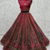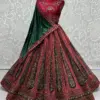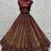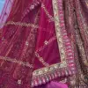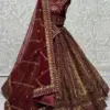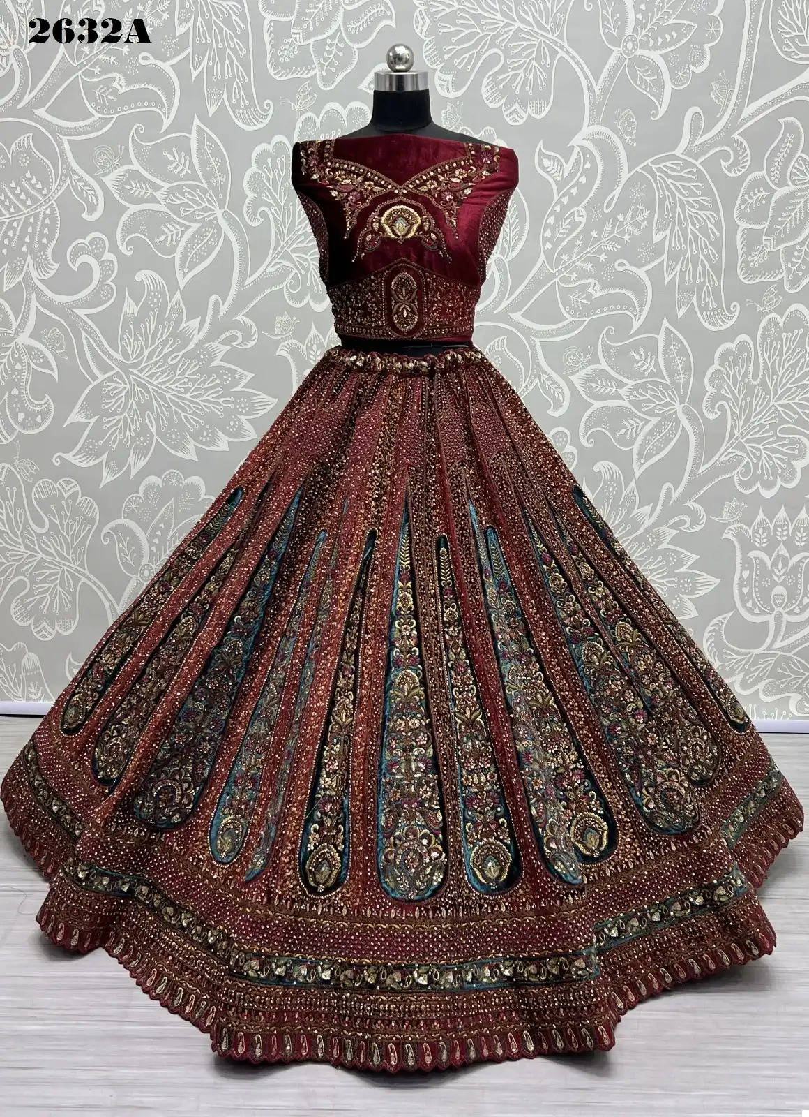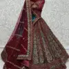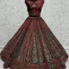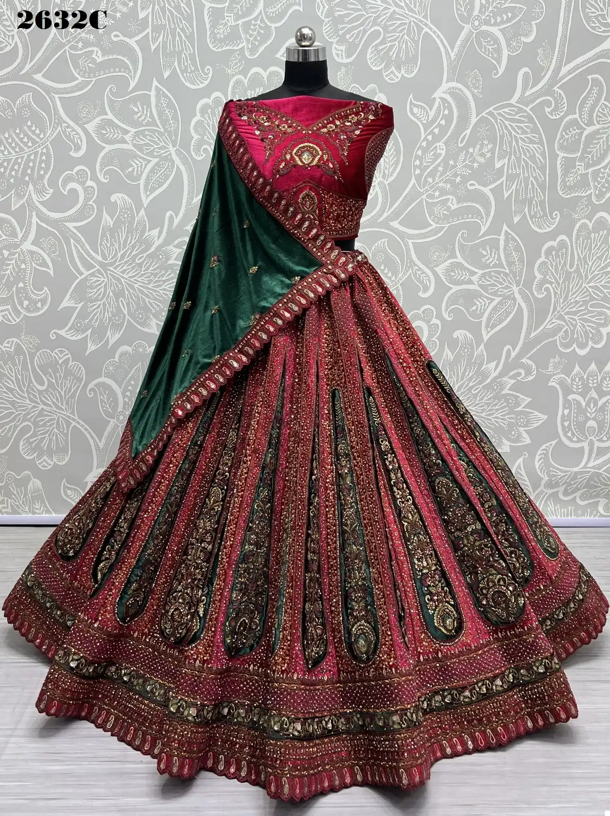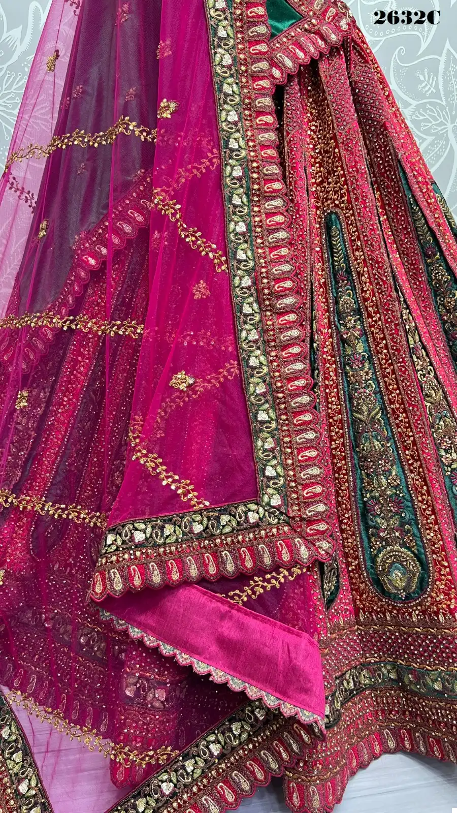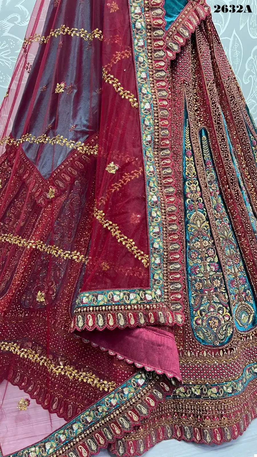 Lehenga: This magnificent lehenga is crafted from high-quality velvet, a fabric renowned for its rich texture and elegant appearance. The velvet lehenga is designed to offer a lavish and royal aesthetic, perfect for grand occasions and weddings.