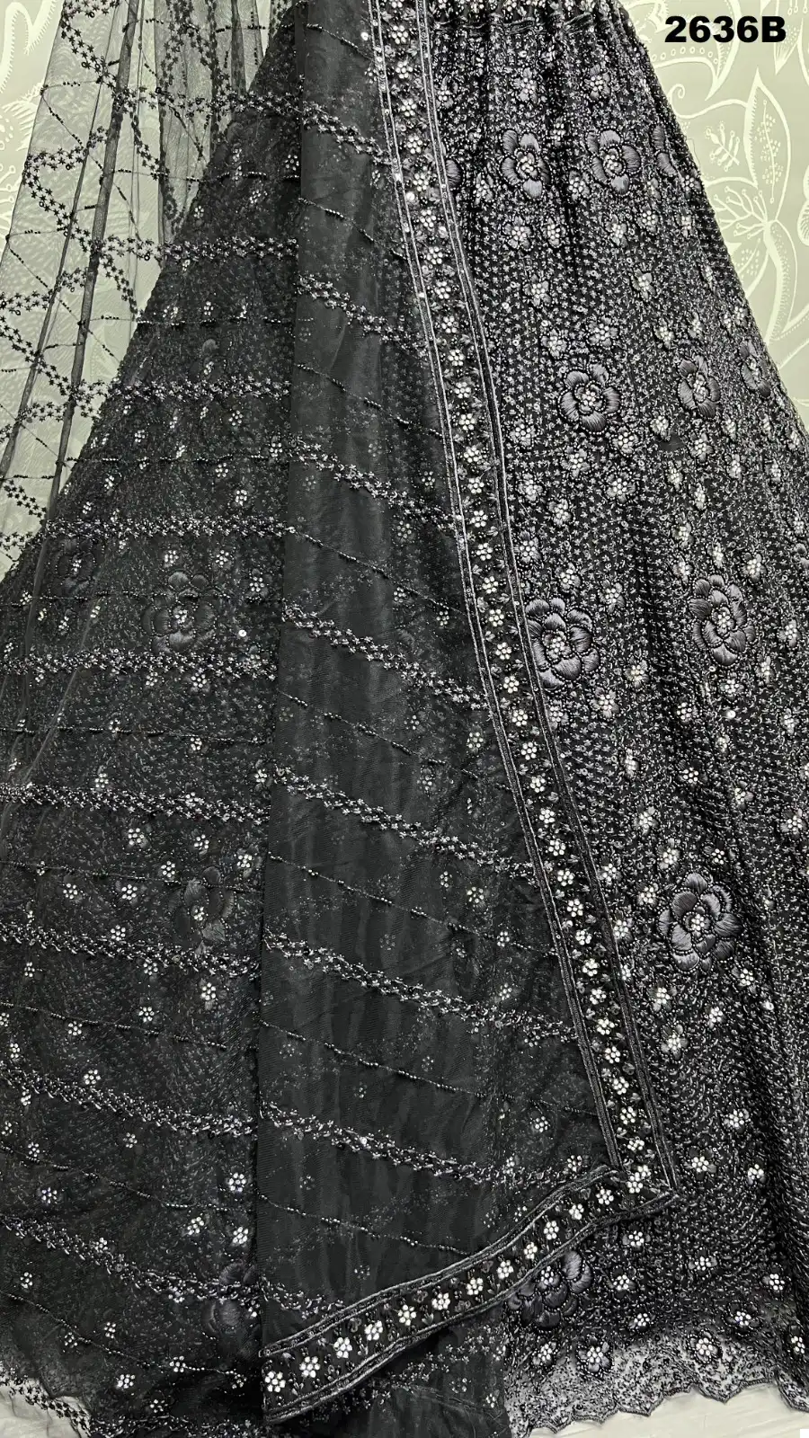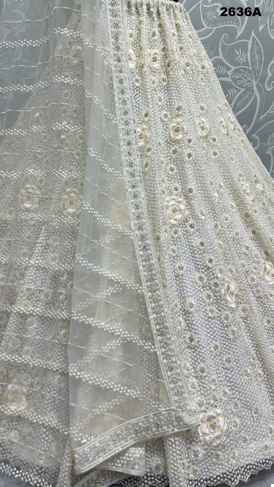 Blouse (Heavy Net): The matching heavy net blouse complements the lehenga perfectly. It features the same intricate handcrafted details, adding cohesiveness to the ensemble. The blouse is designed to enhance your upper body’s grace and style.