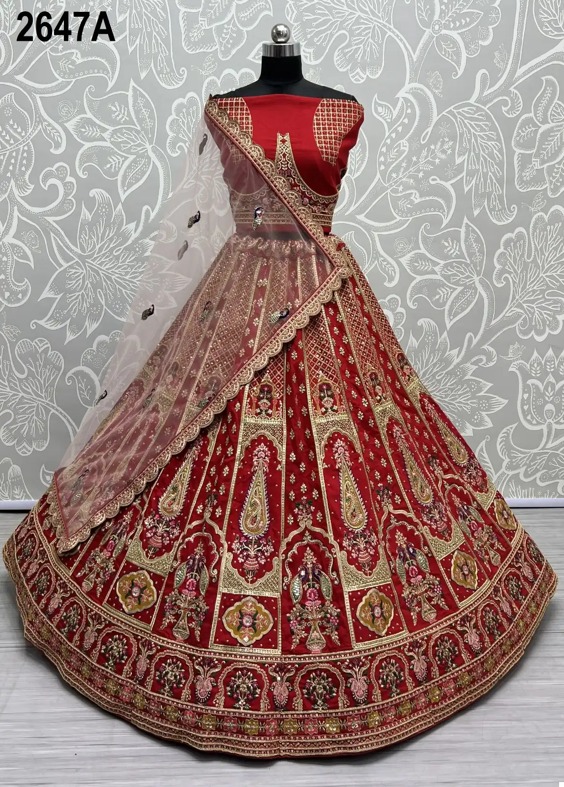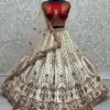 The lehenga is crafted from heavy silk, giving it a rich and regal look. Its exquisite fabric and intricate design make it a standout piece.