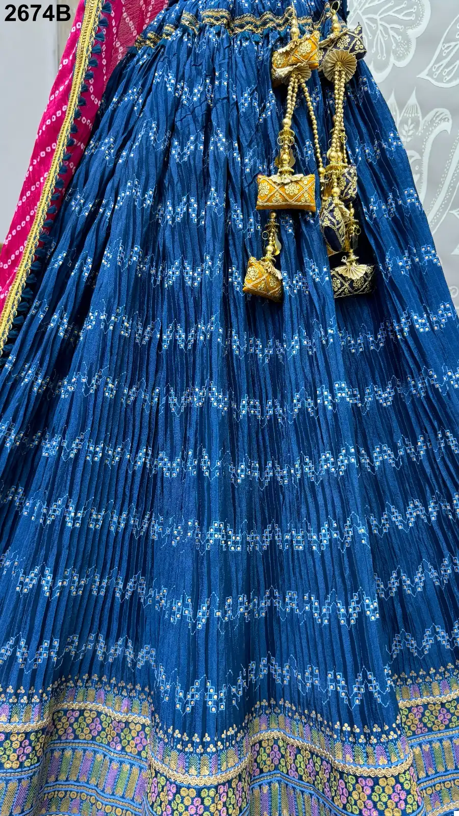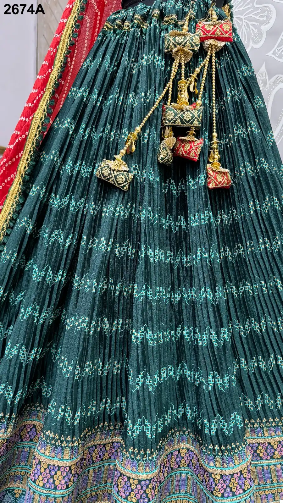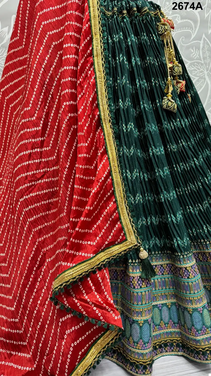 - The lehenga is crafted from Chiffon fabric, known for its lightweight and flowy nature.