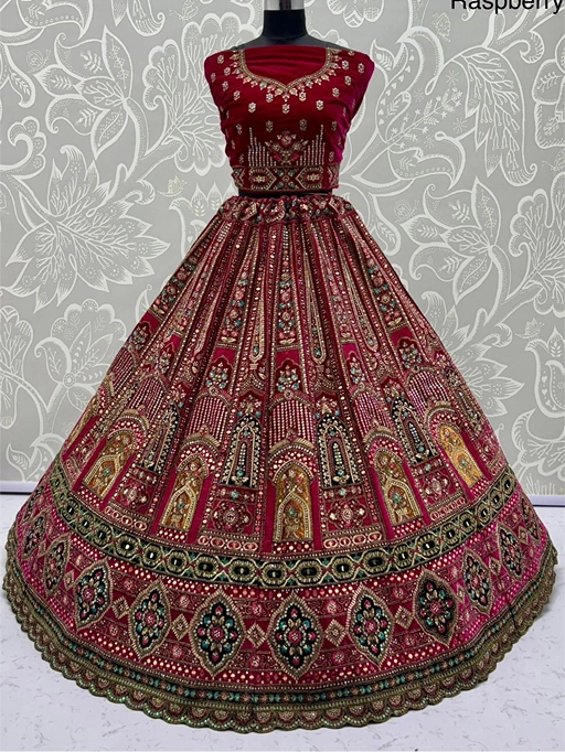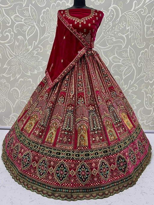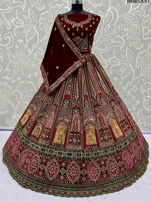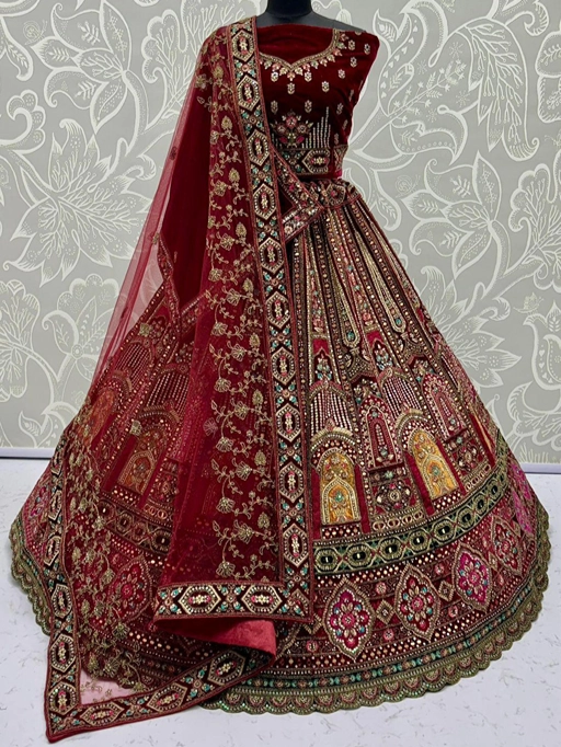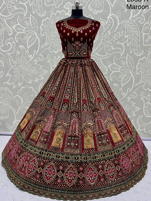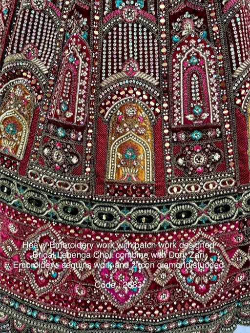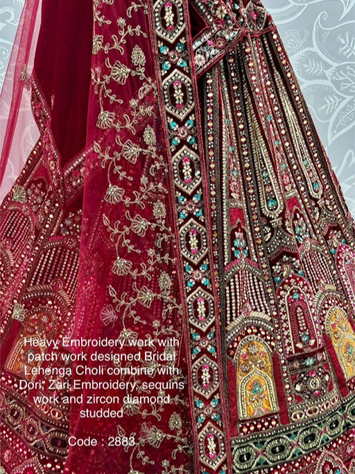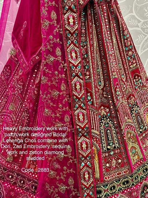 Make a royal statement on your big day with Code 2883 – a grand bridal lehenga choli set crafted from luxurious velvet and adorned with multi-thread, sequins, dori, zari, and all-over zircon work. This masterpiece comes with a double dupatta concept and is ideal for bridal boutiques and wedding retailers looking for premium quality.