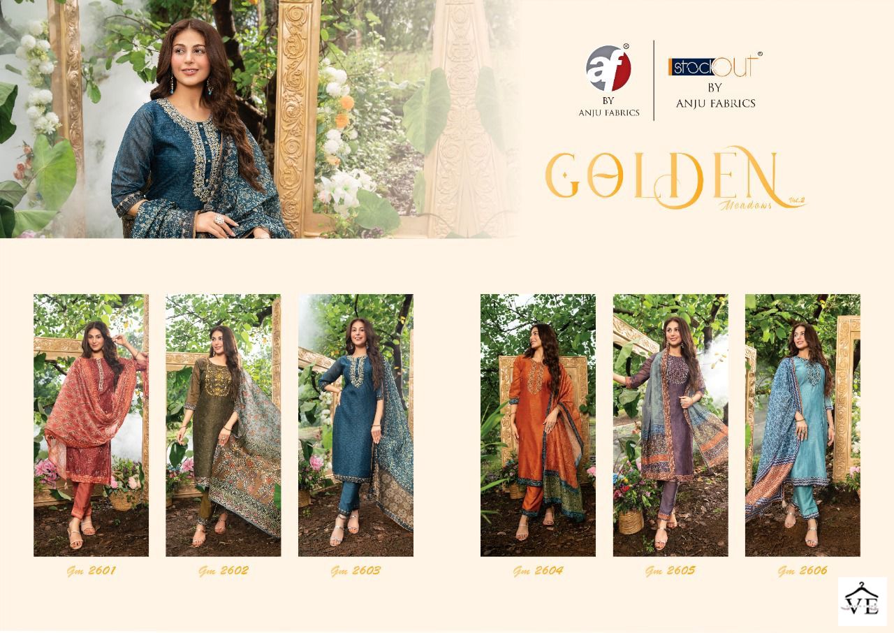 Anju Fabrics Golden Meadows Vol 2 Chanderi Wholesale Readymade Salwar Suit Catalog 6 Pcs. We deal in Kurtis, Sarees, Dresses Materials, Leggings, and Designer Salwar Kameez.