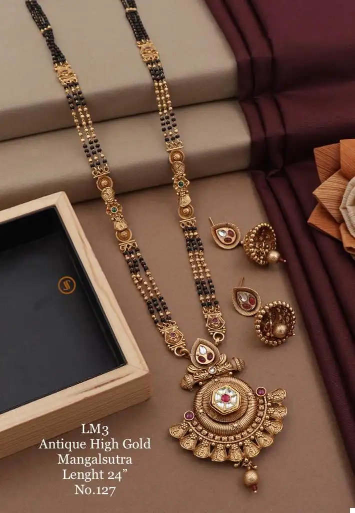 Vintage Elegance: The Antique High Gold Mangalsutra exudes a vintage charm with its high gold finish and antique detailing. Its design captures the essence of traditional Indian jewelry, adding a touch of heritage to your attire.