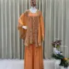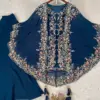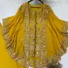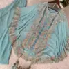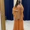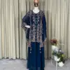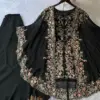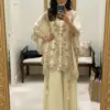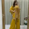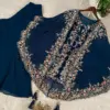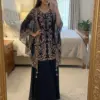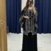 Crafted in luxurious faux georgette, the set features beautiful sequence embroidery work that adds subtle sparkle and a refined festive touch. The coordinated kurta, plazzo, and embroidered shrug together create a graceful layered look—perfect for parties, festive gatherings, evening functions, and celebratory occasions.