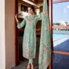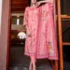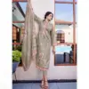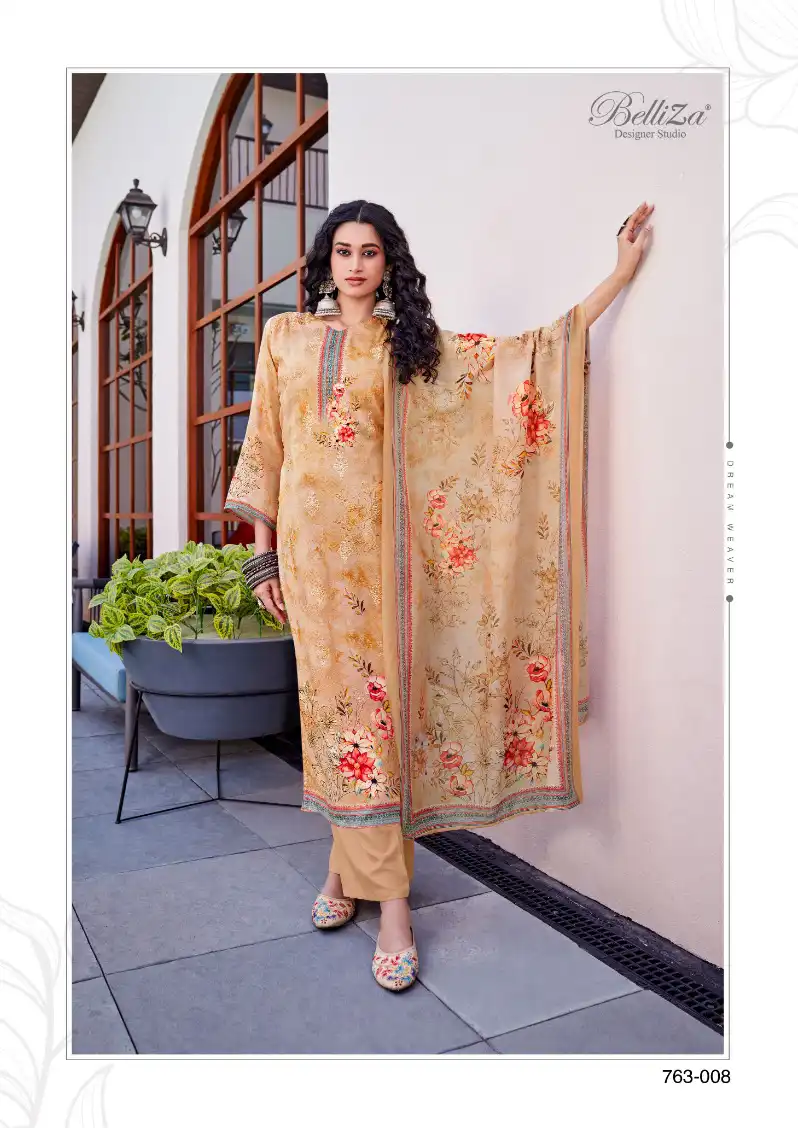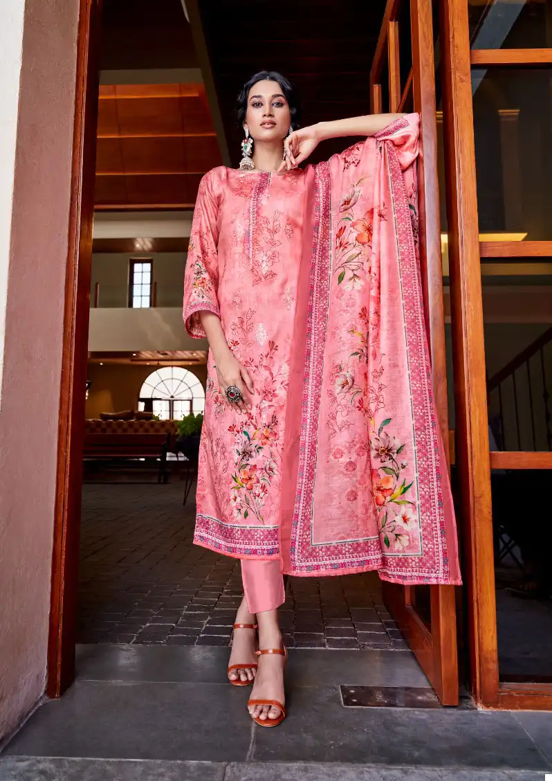 - Top: The top piece, approx. 2.50 meters, is crafted from pure Jam Cotton and features a digital print enhanced with exclusive embroidery work. The fusion of digital print with handcrafted embroidery offers a unique and sophisticated look.