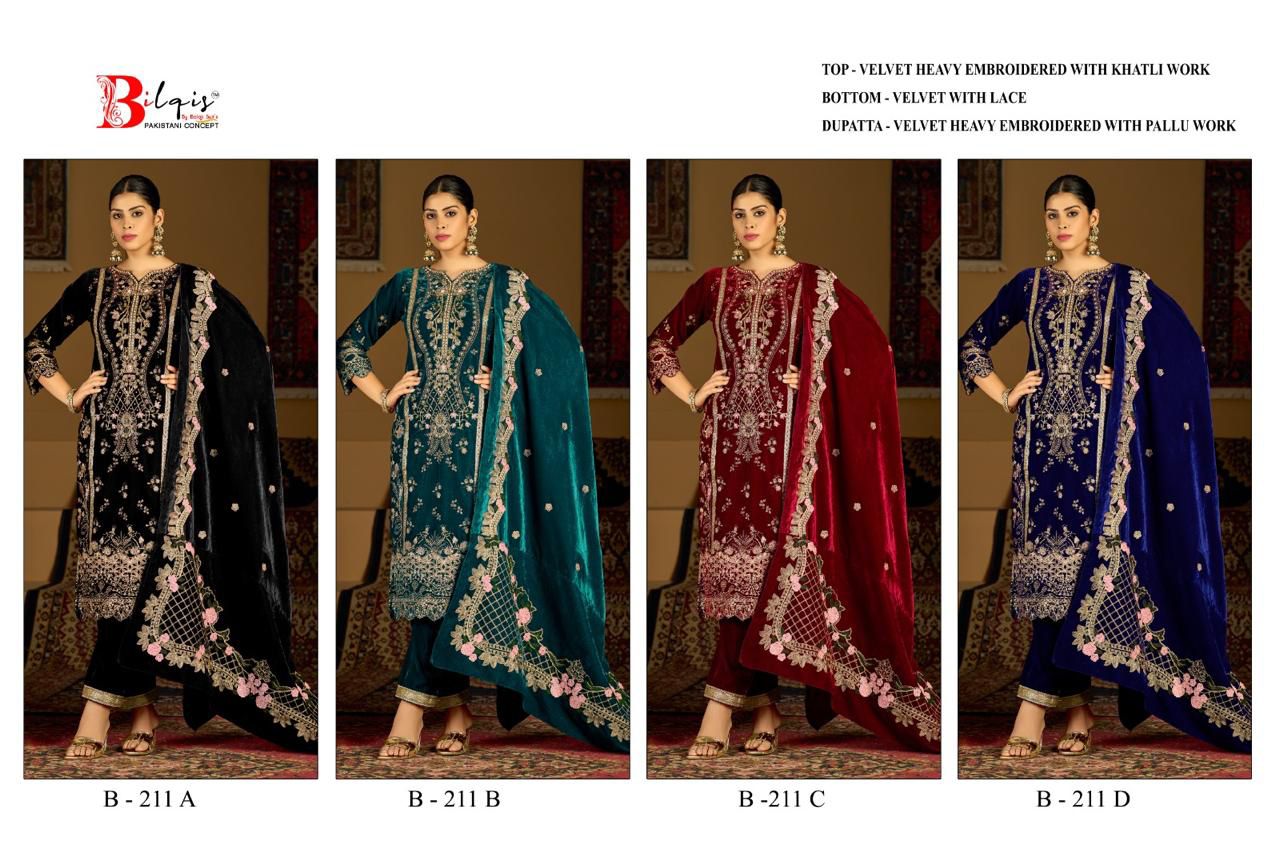 Bilqis B 211 A To D Wholesale Velvet Embroidered Handwork Pakistani Salwar Kameez.