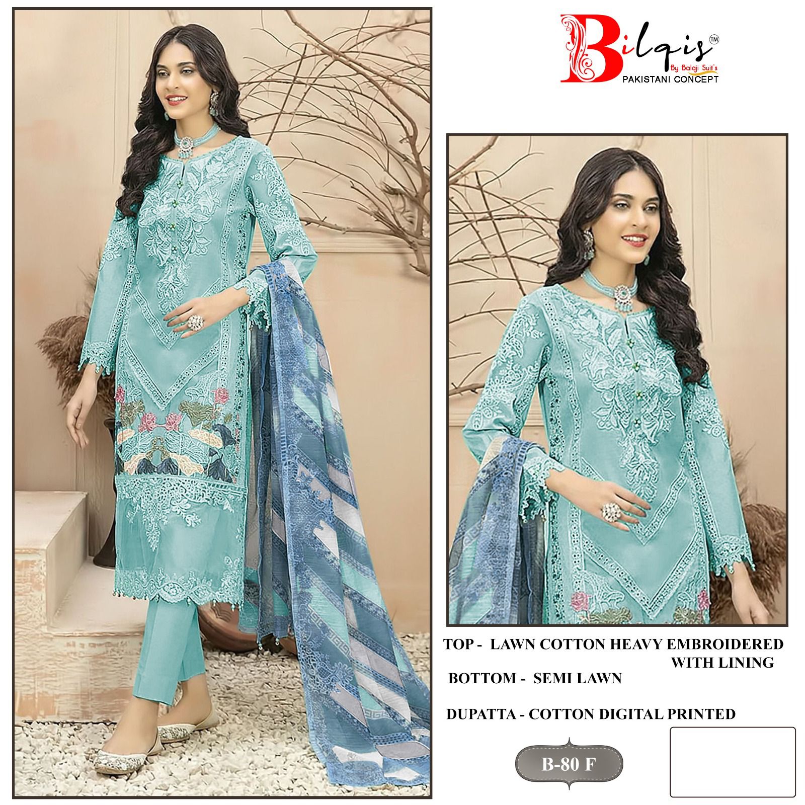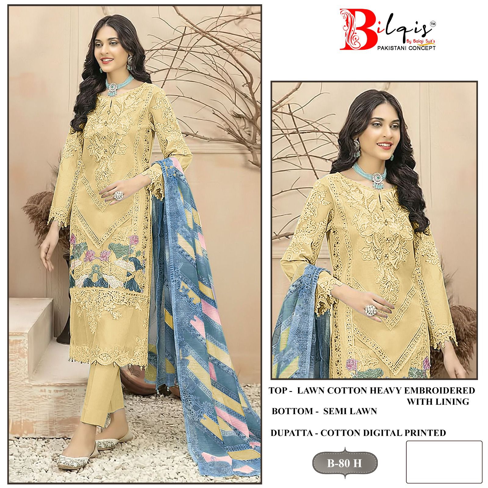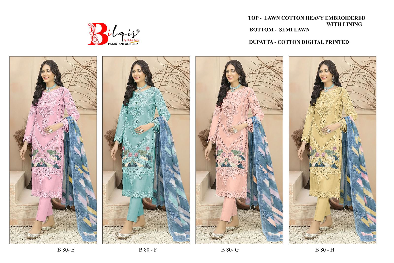 Presenting Bilqis B 80 E To H, an elegant collection featuring heavy lawn cotton embroidery with a digital printed dupatta. This set is perfect for those looking for a balance of comfort and style, with a beautifully crafted lined top, matching lawn cotton bottom, and a chic digital print cotton dupatta. Ideal for casual or semi-formal wear.