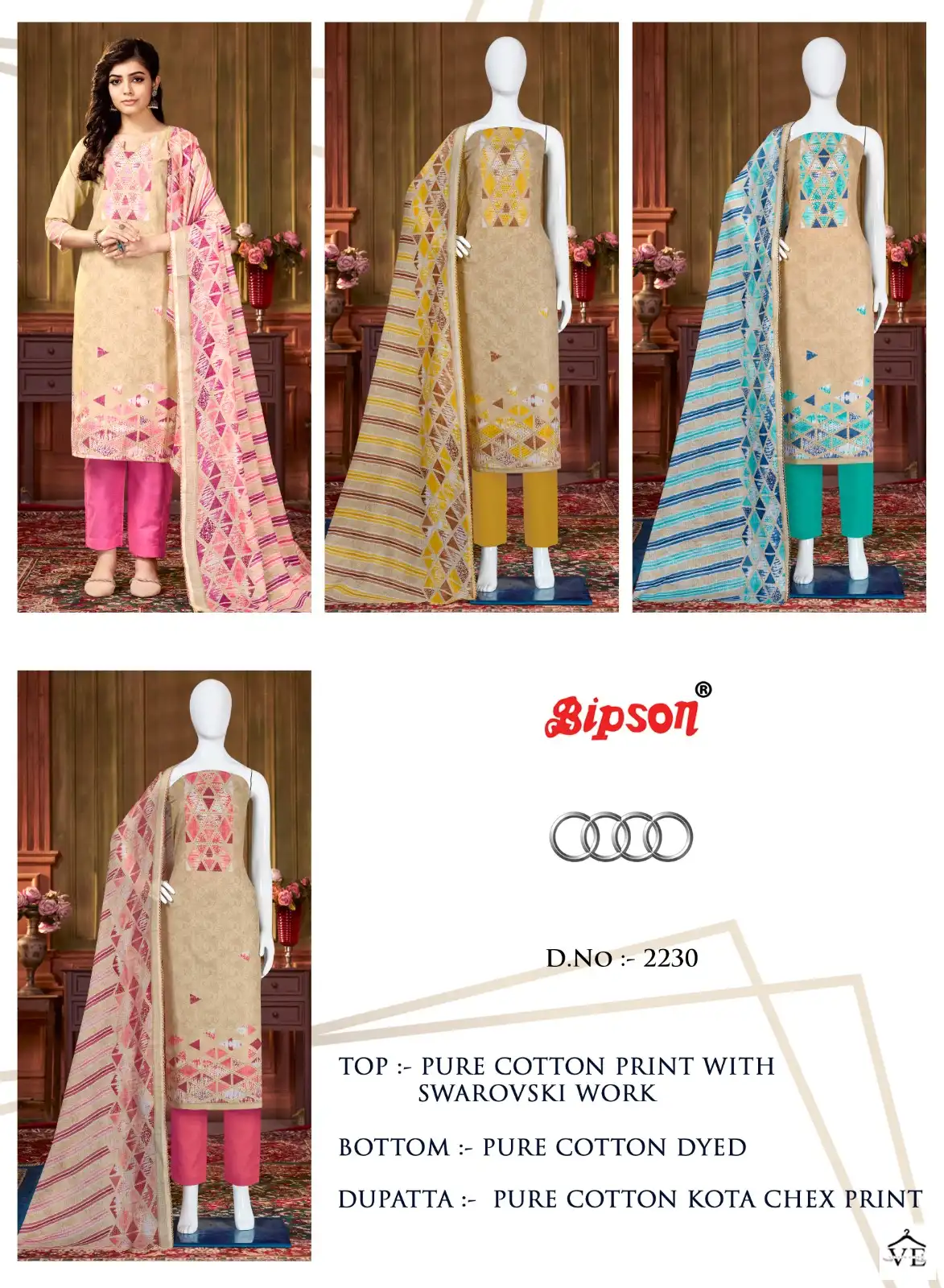 Bipson Audi 2230 Pure Cotton Wholesale Salwar Suit Catalog 4 Pcs. We deal in Kurtis, Sarees, Dresses Materials, Leggings, and Designer Salwar Kameez.