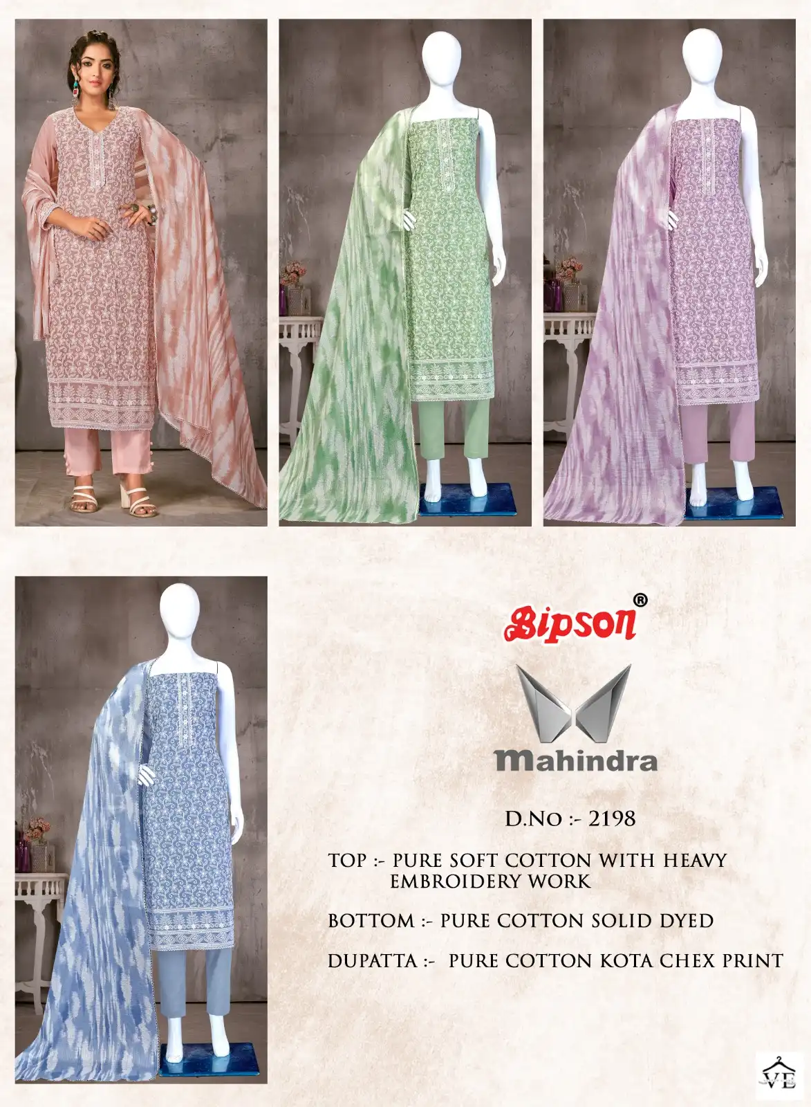 Bipson Mahindra 2198 Pure Soft Cotton Wholesale Salwar Suit Catalog 4 Pcs. We deal in Kurtis, Sarees, Dresses Materials, Leggings, and Designer Salwar Kameez.