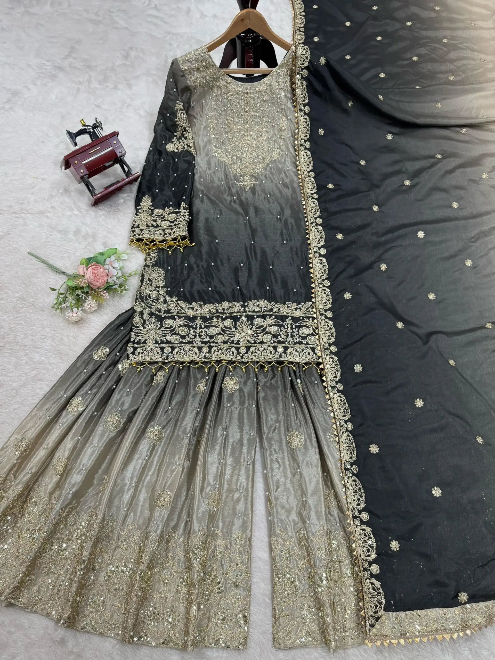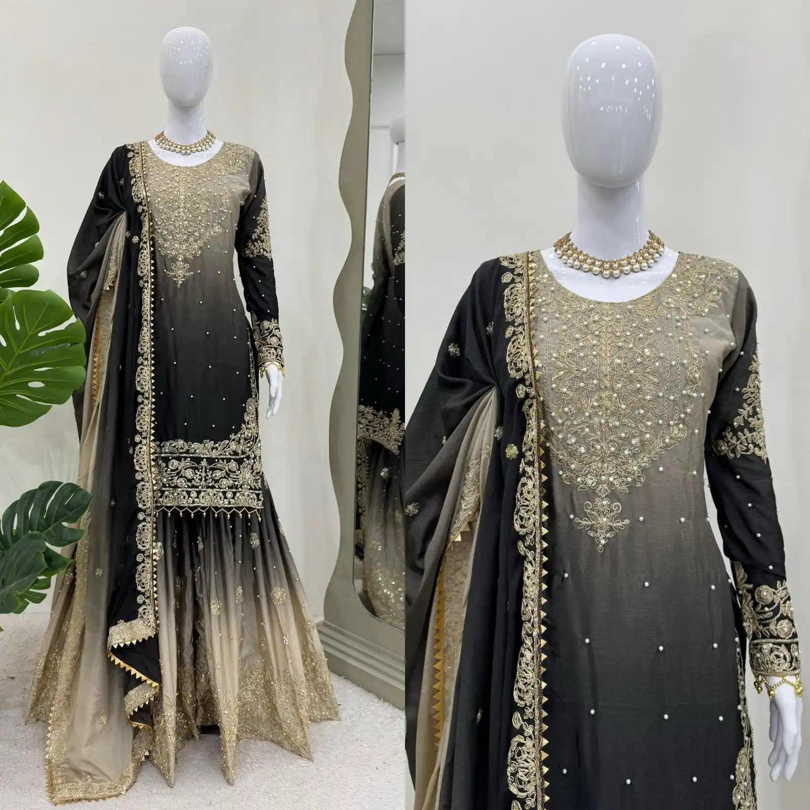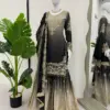 Buy Black & Beige Heavy Chinon with Coding, Sequin & Pearl Work Sharara Suit Online.