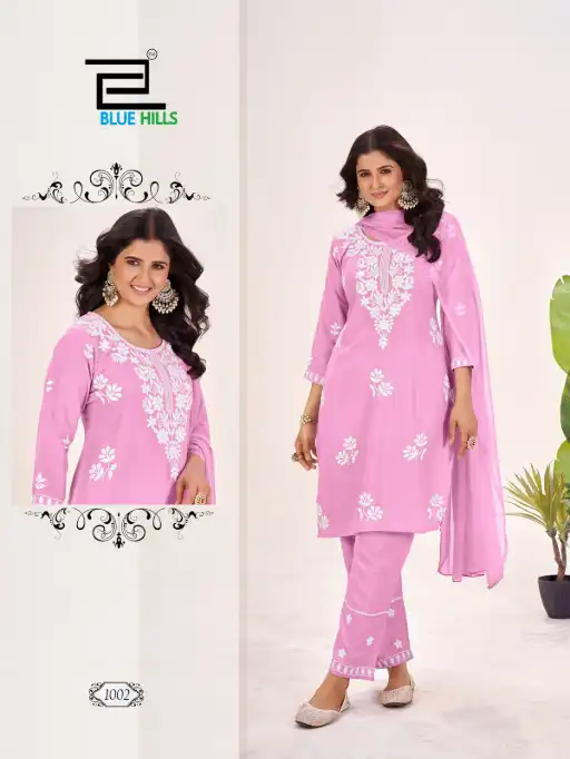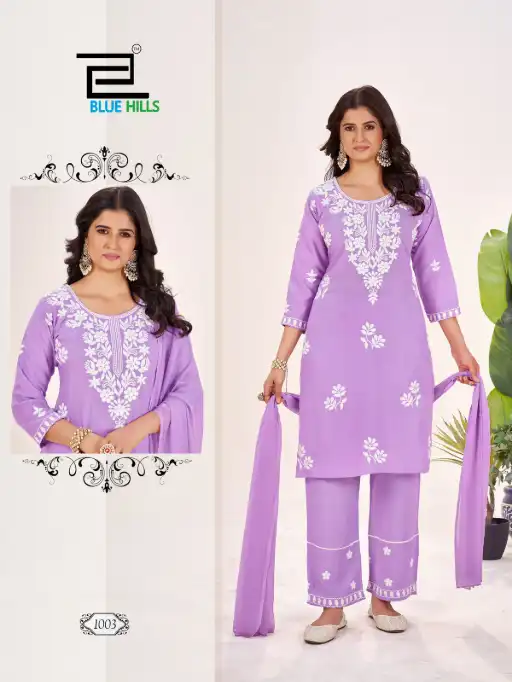 Buy Blue Hills Summer Feels embroidered rayon kurti sets with pant and dupatta at wholesale rate.