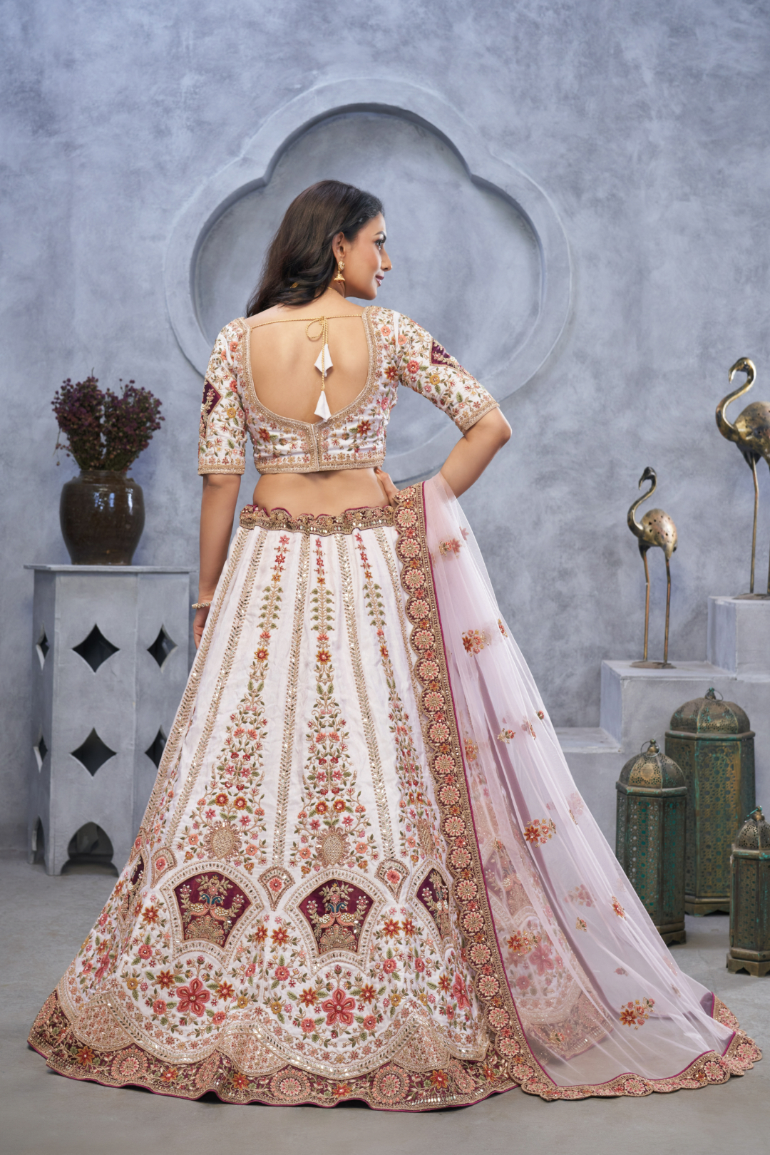 Perfect for weddings and grand celebrations, this light ivory lehenga pairs beautifully with nude block heels to balance the vibrant details. Opt for pearl or diamond jewelry for a sophisticated look, and style your hair in loose waves or a chic bun to accentuate the intricate embroidery and velvet accents.