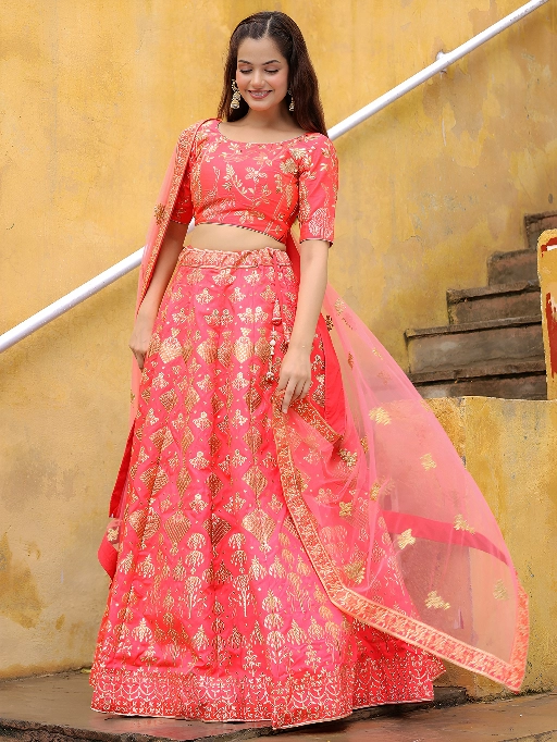 Embrace timeless grace with the Zeel 17055-Peach Embroidered Lehenga Set. Crafted from luxurious slub silk, this semi-stitched lehenga showcases intricate zari and sequins embroidery with a stunning 3.50-meter flair. The unstitched blouse matches the elegance with similar embroidery, while the soft net dupatta completes the look with a delicately embroidered border. Perfect for weddings, festive occasions, and grand celebrations.