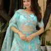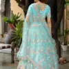 Turn heads with this ethereal Sky Blue Soft Net Lehenga, adorned with delicate thread and sequins embroidery. Designed with a generous flair of approximately 3.50 meters, this semi-stitched lehenga allows custom fitting for waist sizes up to 43″. The matching unstitched blouse in soft net is also beautifully embroidered, while the dupatta features a matching embroidered border for an elegant finish. Perfect for weddings, receptions, and festive occasions.