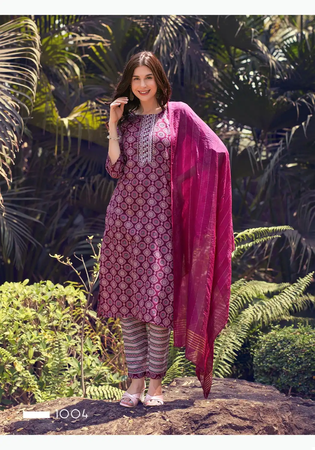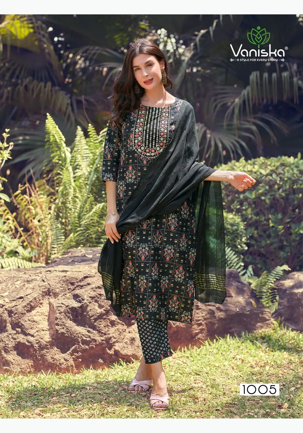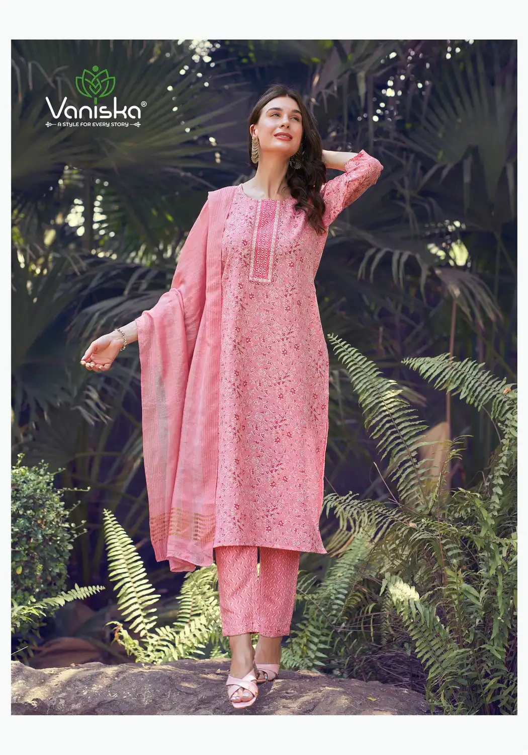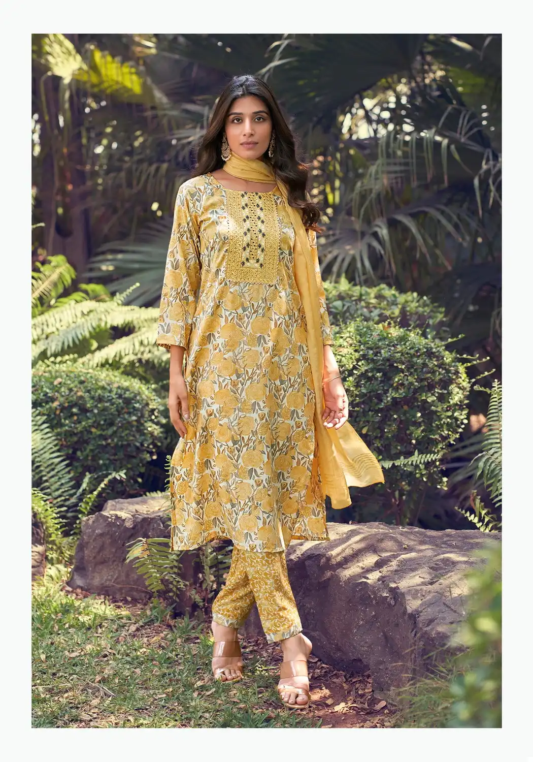 This ensemble seems to offer a set of kurtis with matching bottoms and a Chanderi dupatta. The capsul foil print adds a stylish touch, while the fancy embroidery work enhances its elegance. The availability of various sizes ensures a broader range of customers can enjoy this outfit.