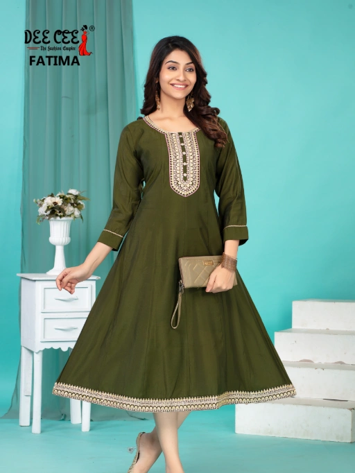 Buy DEECEE Brand FATIMA readymade Roman Silk flared kurtis with computer embroidery at the best wholesale price.