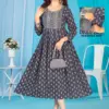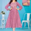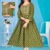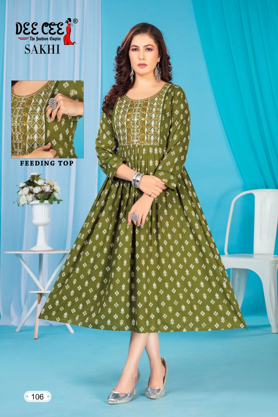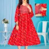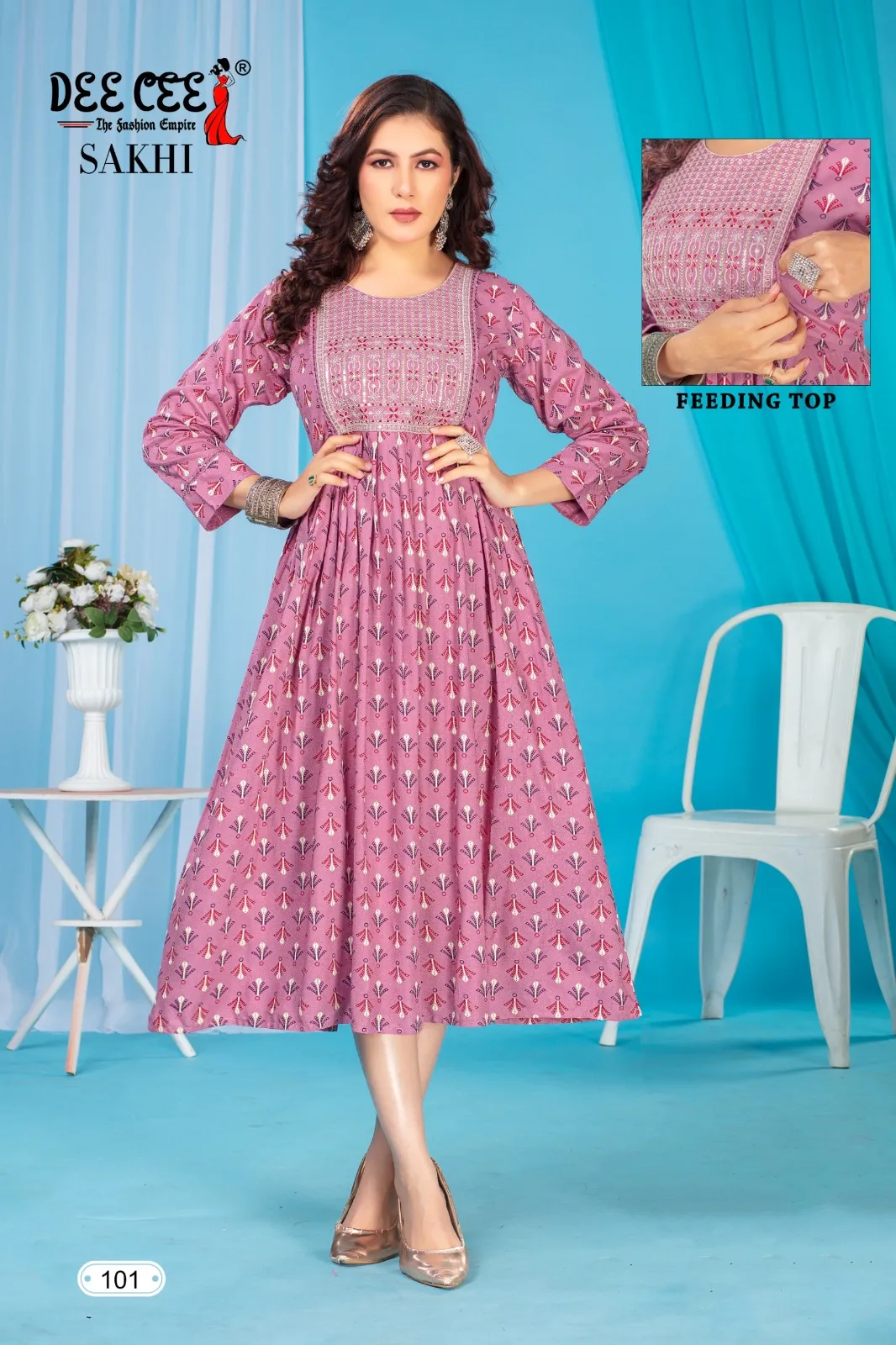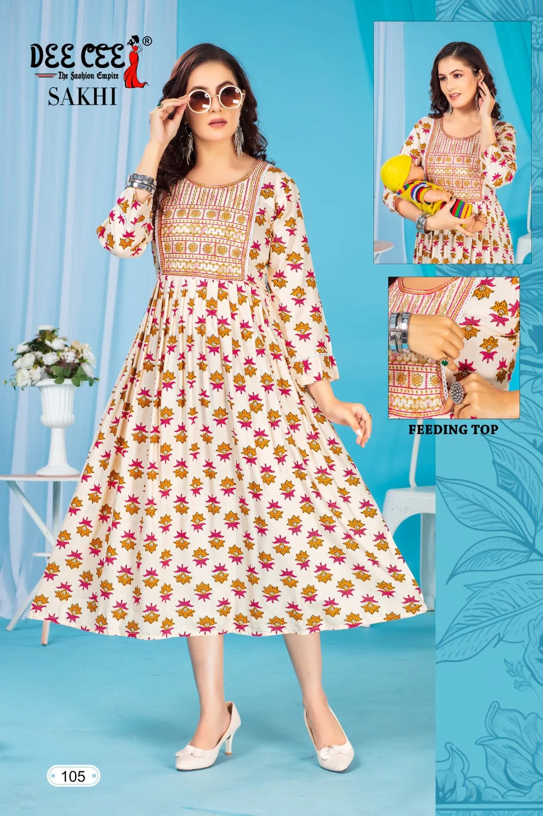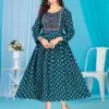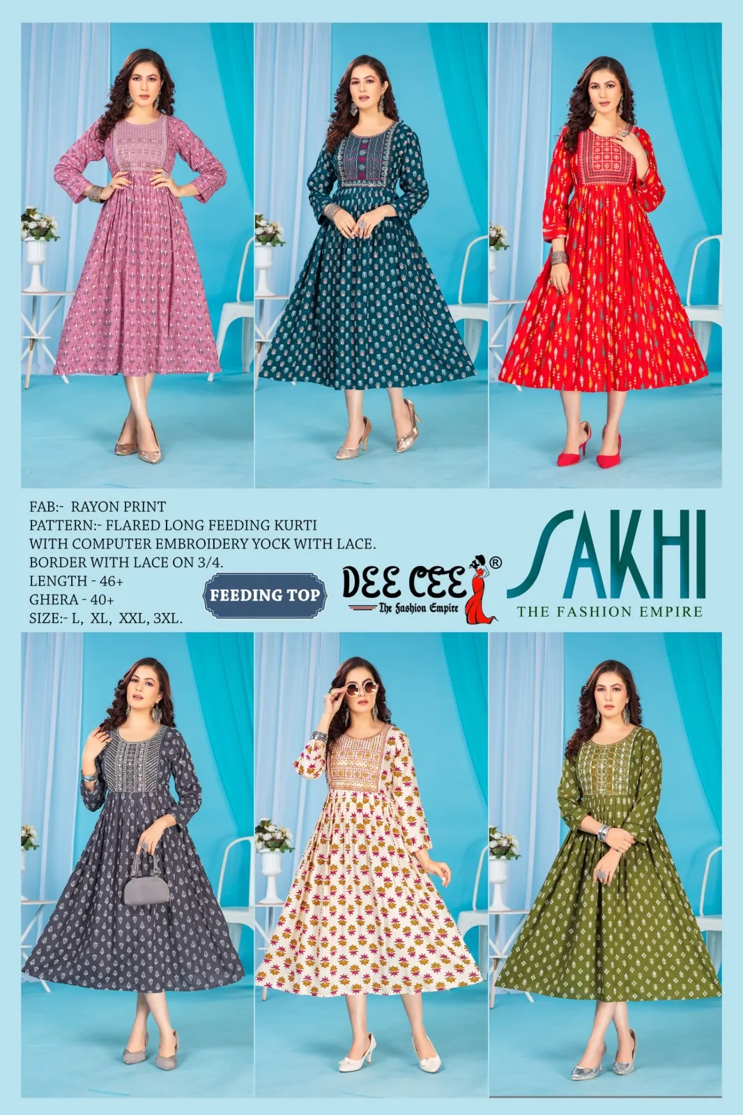 Top Rayon Print Flared Long Feeding Kurti with Computer Embroidery Yock with Lace. Border With Lace On 3/4 Sleeve