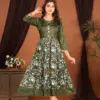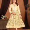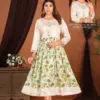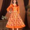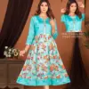 Top | Sartin Stylon Digital Print Flared Long Kurti With Inner Diamond Work On Plain Patti With Printed Choli |
