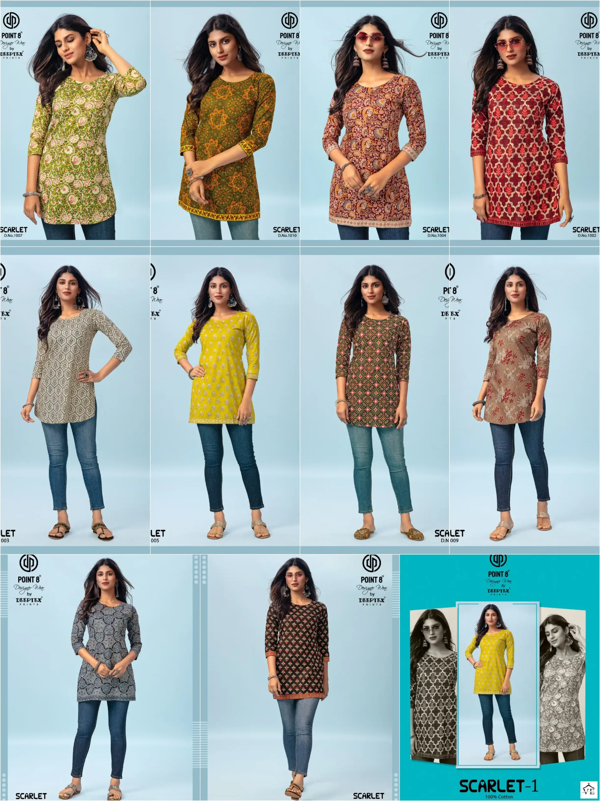 Deeptex Scarlet Vol 1 100% Cotton Wholesale Short Top Kurti Catalog of 10 Pcs. We deal in Kurtis, Sarees, Dresses Materials, Leggings, and Designer Salwar Kameez.